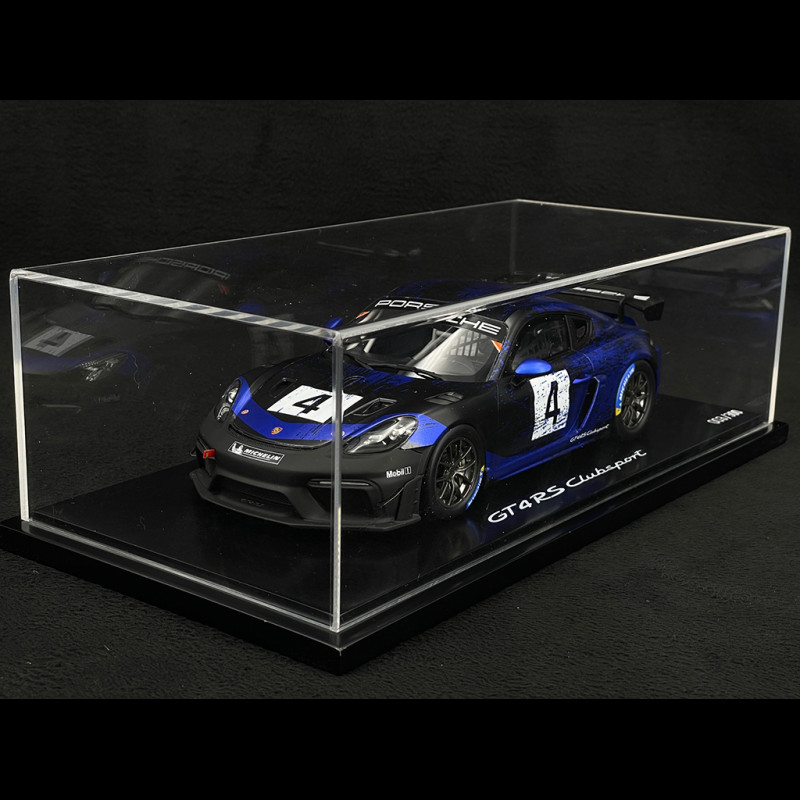 1:18 Modellauto des Porsche 718 Cayman GT4 RS Clubsport Typ 982 in Violett / Schwarz. Harzmodell von Spark, hier als nummeriertes Exemplar Nr. 3/300 mit Vitrine.