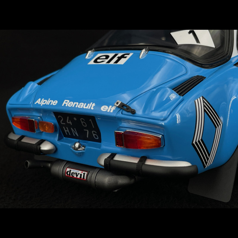 Die Version Nr. 1 von San Remo 1973 ist an ihrer Werksrennlackierung mit Startnummern, zeitgenössischen Sponsorenlogos und Details, die typisch für offizielle Alpine-Fahrzeuge sind, erkennbar. Der reduzierte Innenraum mit Schalensitzen, Überrollkäfig und Rallye-Instrumenten ist ganz auf Leistung und Zuverlässigkeit im Wettbewerb ausgelegt.