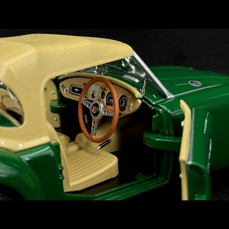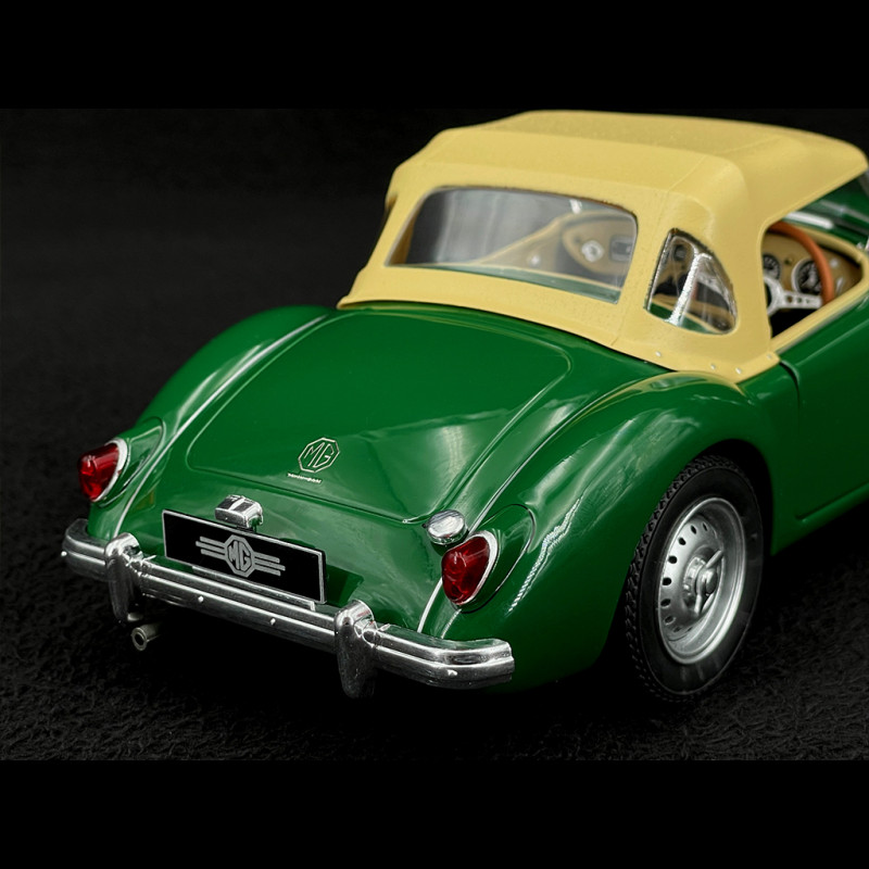 Dieses Modell im Maßstab 1:18 von Triple9 verfügt über eine grüne Karosserie, ein geschlossenes Verdeck, eine cremefarbene Innenausstattung und Chromspeichenräder. Es ist rechtsgelenkt und hat zu öffnende Türen. Im Schaufenster verleiht diese Kombination aus Grün/Creme und Stoffverdeck dem Ganzen einen sehr nostalgischen Charakter und passt perfekt zu einer MGA-Serie (EX182 Le Mans, Hardtop-Coupé, weißer Mk2). So lässt sich auf einem einzigen Tablet eine kleine Geschichte der MG-Linie darstellen.