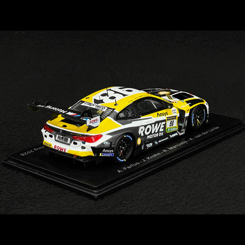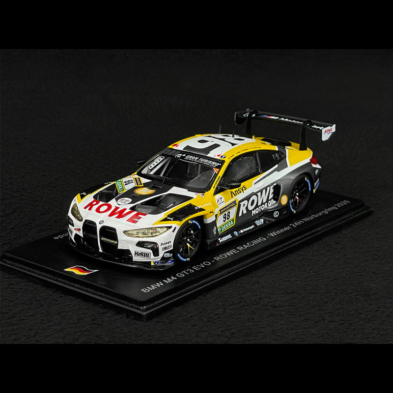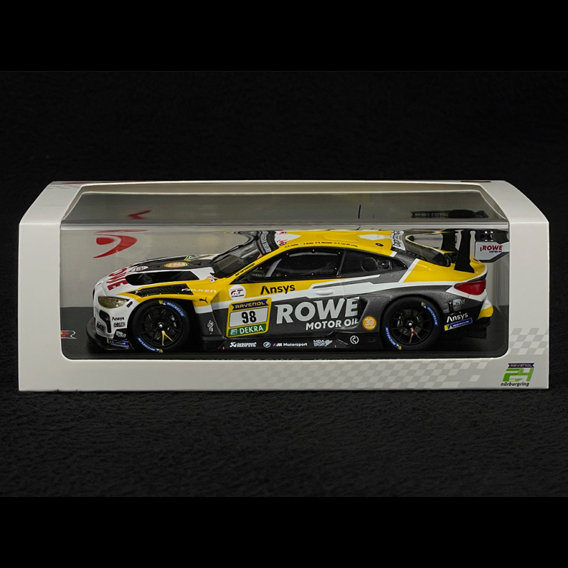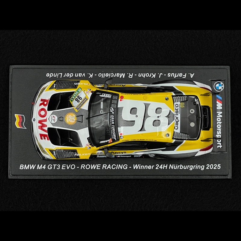 Der BMW M4 GT3 Evo #98 – Sieger der 24 Stunden vom Nürburgring 2025 – im Maßstab 1:43 von Spark Models ist eine hochwertige Nachbildung des Siegerfahrzeugs von ROWE Racing, das 2025 beim legendären deutschen Langstreckenrennen an den Start ging.