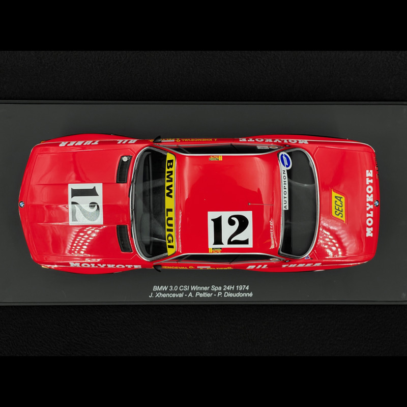 Diese Reproduktion im Maßstab 1:18 aus Kunstharz ist eine Hommage an den BMW 3.0 CSi Nr. 12, Sieger des 24-Stunden-Rennens von Spa-Francorchamps 1974 mit den Fahrern Jean Xhenceval, Alain Peltier und Pierre Dieudonné. Die historische Lackierung und die offiziellen Markierungen wurden sorgfältig reproduziert und spiegeln die visuelle Identität dieses BMW-Rennwagens perfekt wider. Die Details der Karosserie, der Räder, der Scheinwerfer und des Cockpits sind fein gearbeitet und bieten einen beeindruckenden Realismus. Dieses Sammlerstück wird mit einer Vitrine geliefert und vereint hochwertige Verarbeitung, historische Authentizität und Prestige – ideal für Fans klassischer Langstreckenrennen.