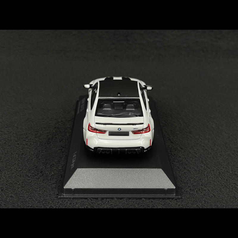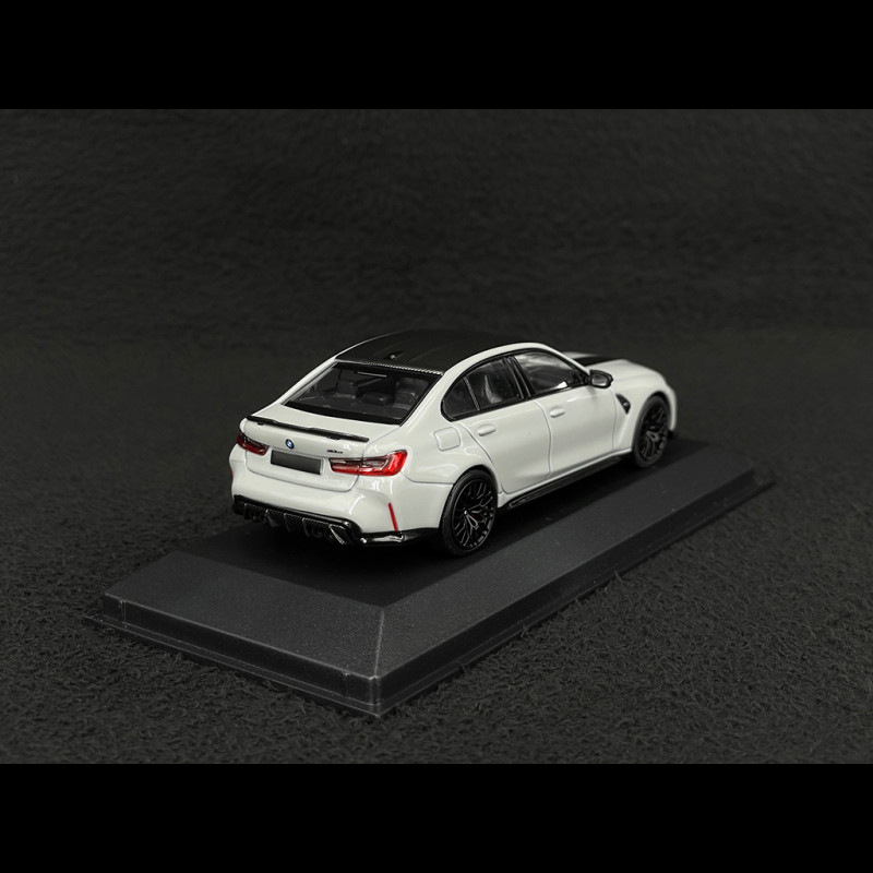 Der BMW M3 CS von 2023 besticht durch seine straffe, athletische Silhouette mit einer skulpturalen Motorhaube, markanten Kotflügeln und einem kompakten Heck, die sofort den Eindruck einer kultivierten Sportlimousine vermitteln. Der Kontrast zwischen der weißen Karosserie und den dunklen Elementen (Kühlergrill, Lufteinlässe, Fensterrahmen, Diffusor) unterstreicht seinen radikalen Charakter und wirkt gleichzeitig in der Vitrine sehr elegant.