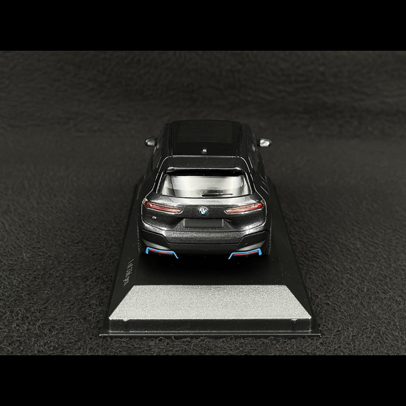Im Maßstab 1:43 fängt die Metallic-Grau-Lackierung das Licht auf den großen Karosserieflächen wunderschön ein: Die Kanten der Kotflügel, die Unterbrechung der Gürtellinie und die kantige Form des Hecks kommen in der Vitrine besonders gut zur Geltung. Die dunklen Einsätze, die robusten Felgen und die sehr grafische Frontpartie (geschlossener Kühlergrill, schmale Lichtsignaturen) verleihen dem Miniaturmodell eine massive und hochmoderne Präsenz, ideal, um eine Ecke der „elektrischen SUVs“ zu verankern oder sich mit dem i4 M50 in einer aktuellen BMW-Sammlung zu messen.