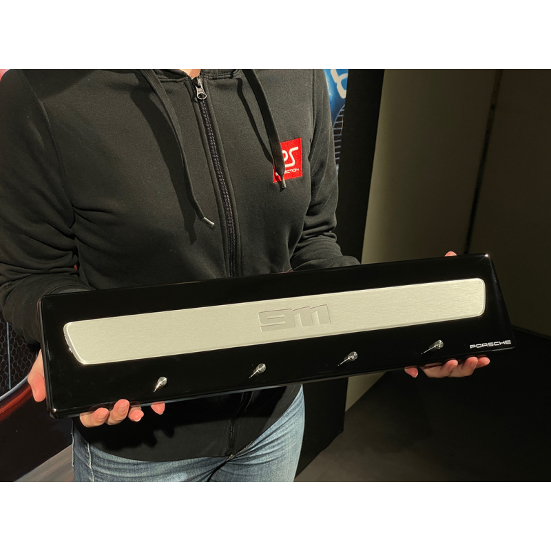 In schwarzem Hochglanz gefertigt und mit einer echten, gebürsteten Porsche 911 Einstiegsleiste aus Edelstahl versehen, bietet er Platz für bis zu vier Autoschlüssel und verleiht Ihrem Zuhause oder Ihrer Garage eine edle Note.