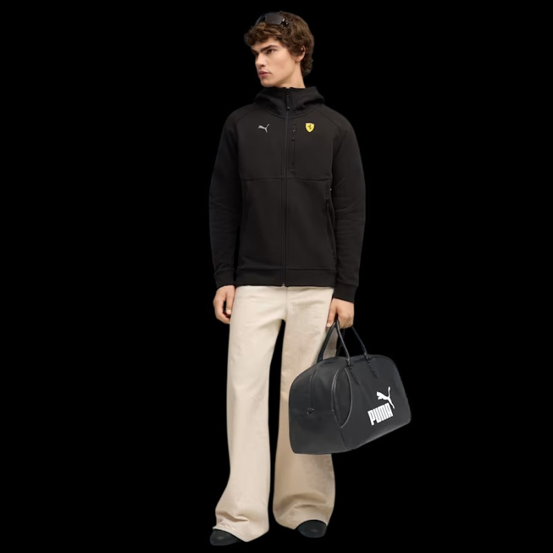 Dieses schwarze Ferrari Sweatshirt von Puma kombiniert Komfort, Technik und F1-Stil. Mit aufgedruckten Ferrari- und Puma-Logos, fest angebrachter Kapuze, Seitentaschen mit Reißverschluss und rotem „PUMATECH“-Schriftzug am linken Ärmel. Getragen von Leclerc und Hamilton.