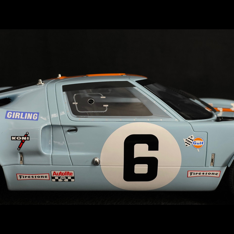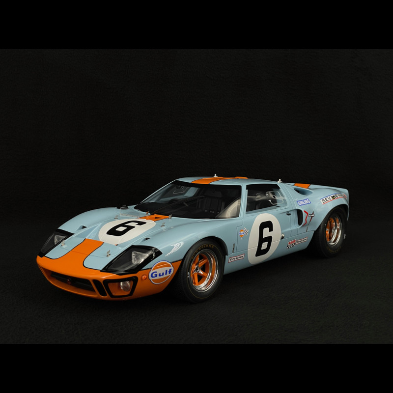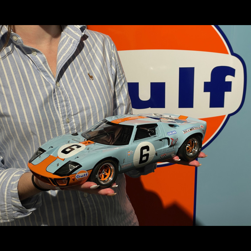 Die Lackierung mit der Startnummer 6 in den berühmten Gulf-Farben Blau und Orange ist zu einer Ikone des Motorsports geworden. Der minimalistische, fahrerorientierte Innenraum spiegelt die Reinheit und Präzision des Langstreckenrennsports wider.