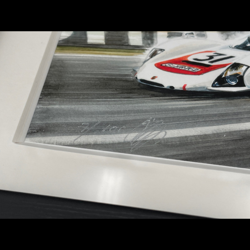 Doch Ehrets Werk beschränkt sich nicht auf diesen impressionistischen Stil; es wird auch durch die Geschichte eines bestimmten Rennens, das Leben eines Fahrers, den Höhepunkt eines Wettbewerbs oder einen historischen Moment im Motorsport ergänzt. Uli Ehret liest viel über Motorsport, sowohl über aktuelle als auch über historische Ereignisse. Seine Bibliothek umfasst mehrere hundert Bücher über alle Arten von Autos, Fahrern und Epochen. So zeigt ein Gemälde nicht nur ein schnelles Auto, sondern erzählt auch die Geschichte des Fahrers oder eines bestimmten Renntages, reich an historischen Details.