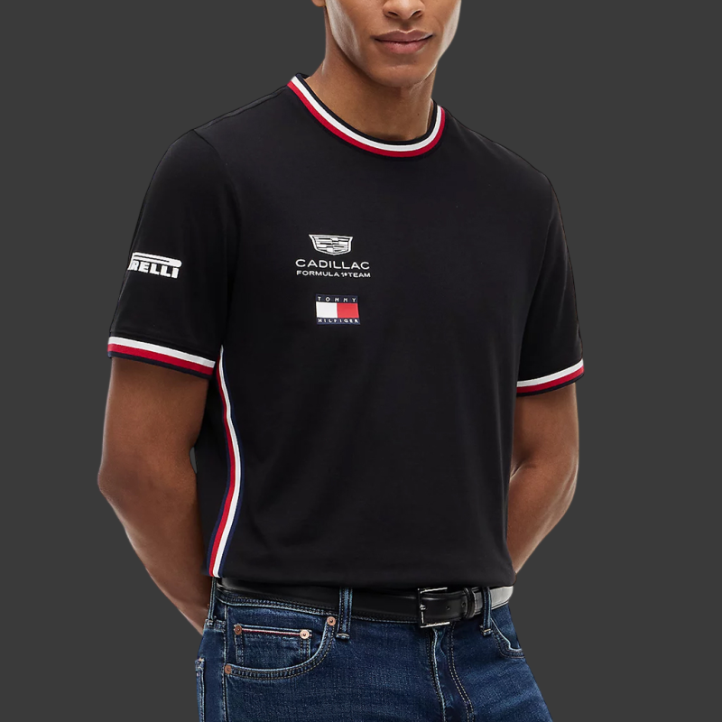 Die Partnerschaft zwischen Cadillac F1 und Tommy Hilfiger begleitet Cadillacs Einstieg in die Formel 1 im Jahr 2026 mit einer Replica-Linie. Das T-Shirt vereint den unverkennbaren Stil des Teams: Schwarz mit Akzenten in Rot, Blau und Weiß, Cadillac F1-Logos und den dreifarbigen Details von Tommy Hilfiger. Ziel ist es, eine Fan-Garderobe anzubieten, die dem Outfit des Teams und der Fahrer entspricht und gleichzeitig alltagstauglich ist.