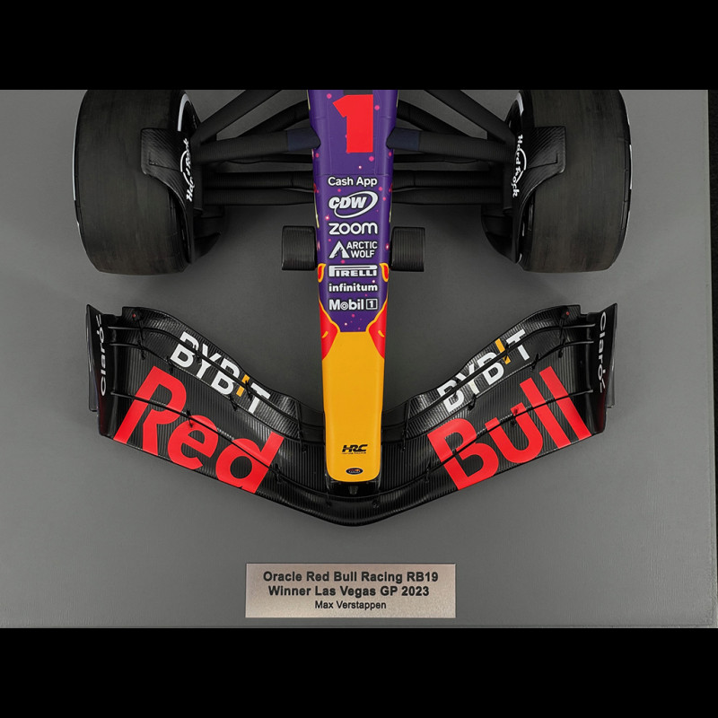 Der Red Bull RB19 mit der Startnummer 1, gefahren von Max Verstappen und siegreich beim Großen Preis von Las Vegas 2023, verkörpert die Spitze der modernen Formel 1. Ausgestattet mit einem extrem leistungsstarken Hybrid-Turbo-V6 und einem bemerkenswert effizienten aerodynamischen Chassis, glänzt er sowohl in Höchstgeschwindigkeit als auch in Stabilität entscheidende Eigenschaften auf dem neuen, schnellen Kurs von Las Vegas.