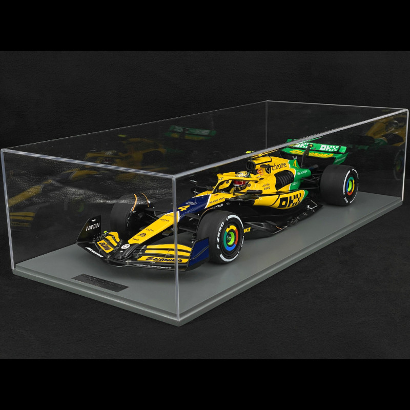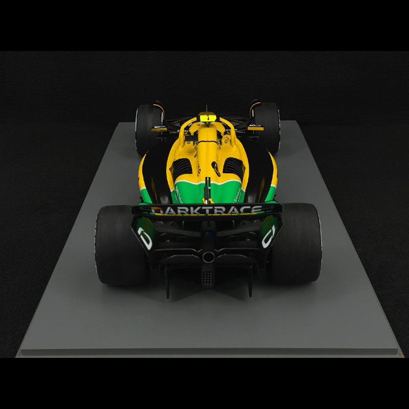 Diese Spark-Miniatur im Maßstab 1:12 bildet den MCL38 Monaco in einem großen Vitrinenformat detailgetreu nach: feine Proportionen, Slick-Reifen, detaillierter Halo und alle Sponsorenlogos sind originalgetreu nachgebildet. Montiert ist das Modell auf einem Sockel mit einer beschreibenden Plakette. In diesem Maßstab umhüllen die gelb-grün-blauen Grafiken im Senna-Stil das Auto förmlich und betonen jede aerodynamische Fläche. So wird dieser Formel-1-Wagen zu einem echten Blickfang in jeder Sammlung, die McLaren, Sonderlackierungen oder dem Vermächtnis von Ayrton Senna gewidmet ist.