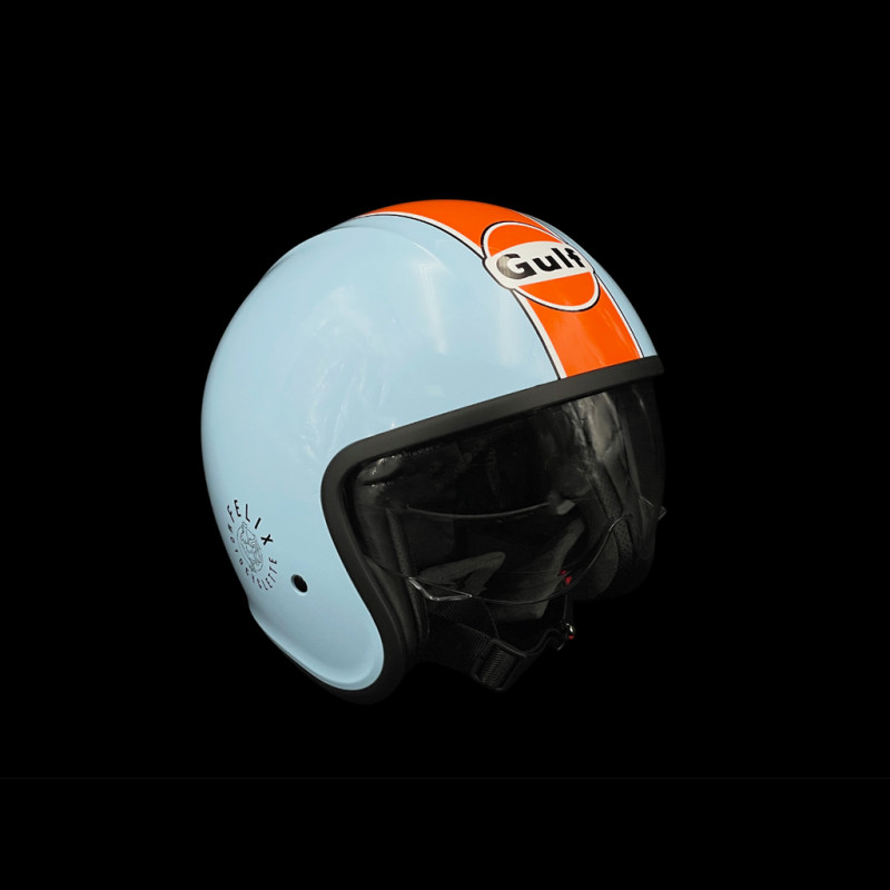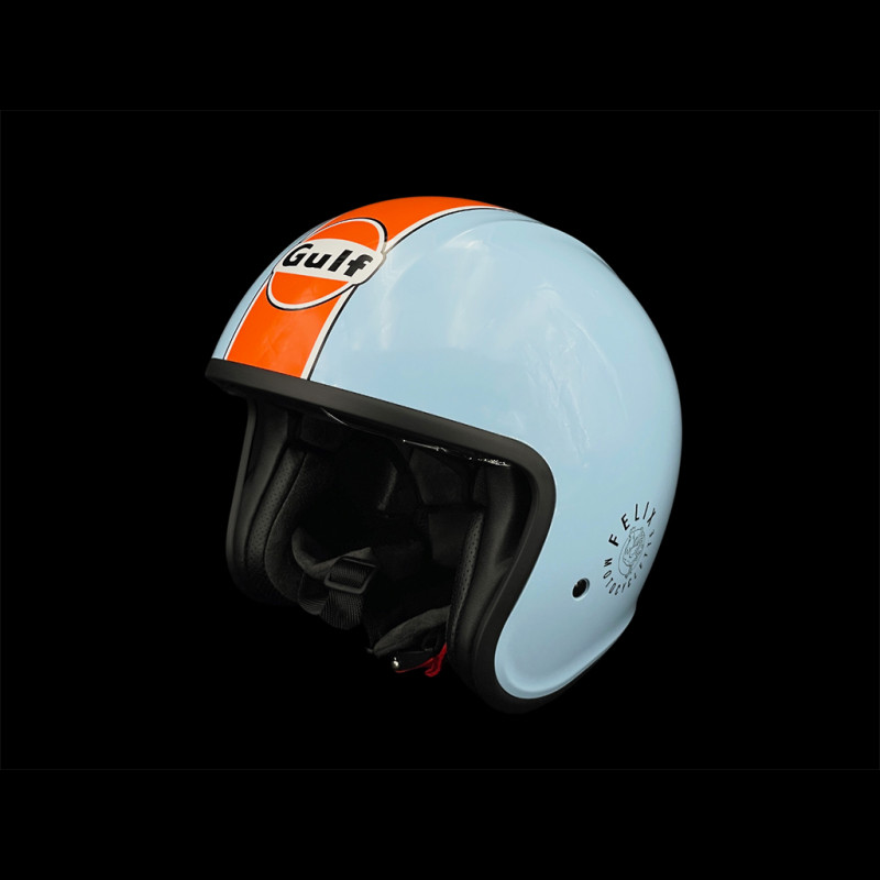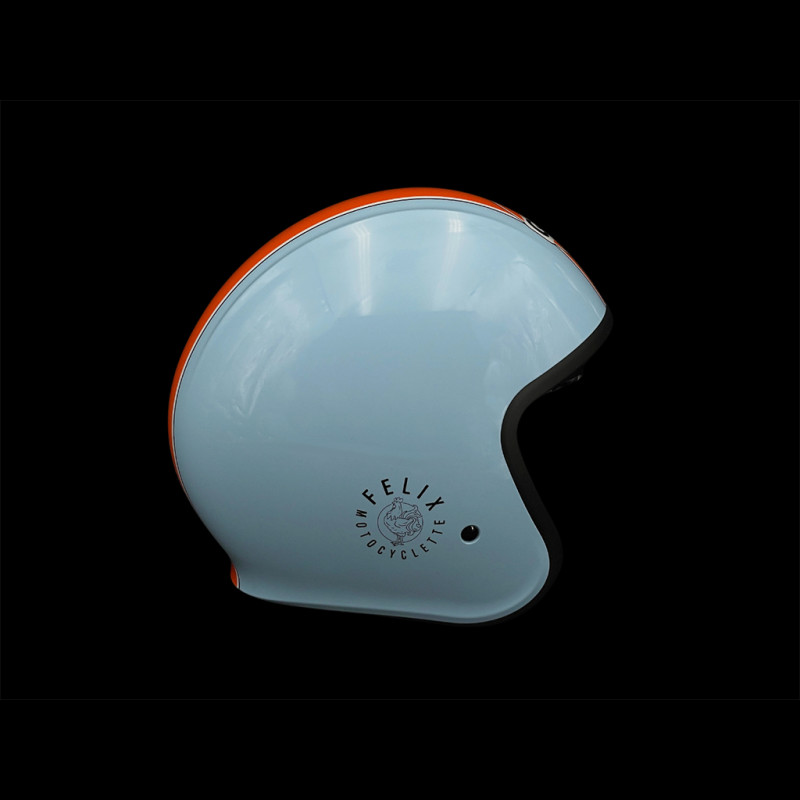 Dieser offene Helm mit Polycarbonat-Außenschale in Gulf-Blau mit orangefarbenem Streifen und aufgedruckten Felix Motocyclette-Logos an den Seiten sorgt für einen unverwechselbaren Vintage-Look. Die gepolsterte Innenausstattung bietet Komfort und Stil. Zum Lieferumfang gehört außerdem eine Schutzhülle. Damit ist der Helm ideal für alle, die ihr Gulf-Outfit vervollständigen oder ihre Oldtimer-Ausflüge mit dem passenden Accessoire aufwerten möchten.