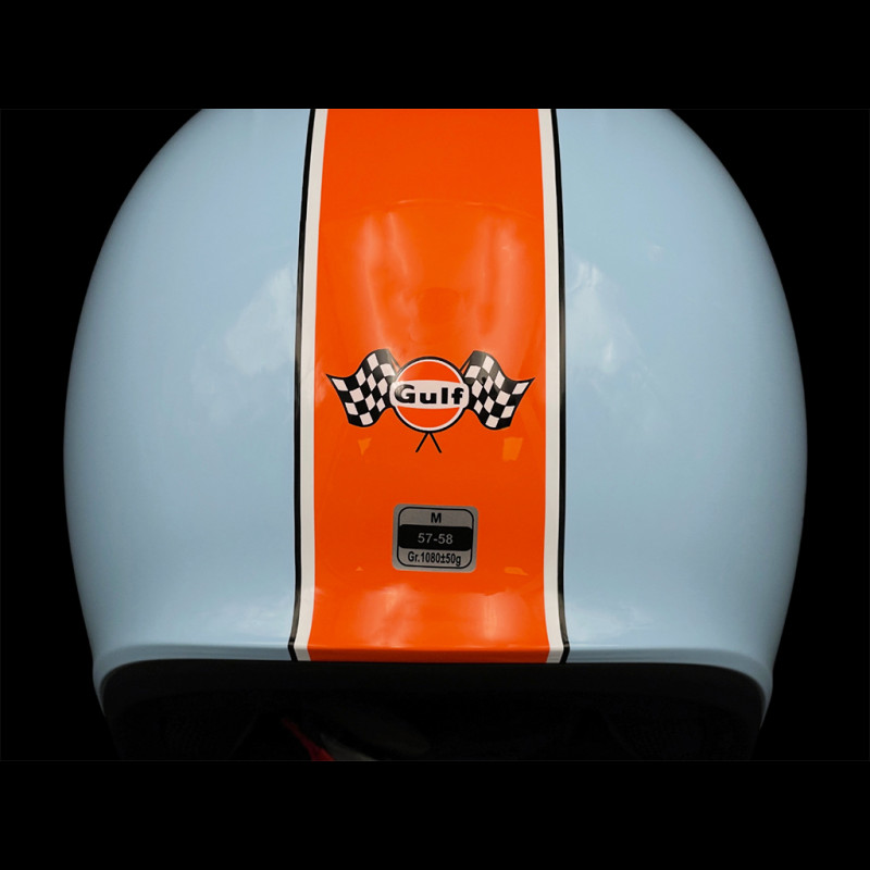 Der Gulf ST580 Helm präsentiert sich im ikonischen Gulf-Design mit himmelblauer Farbe und einem breiten orangefarbenen Streifen – eine Hommage an die Rennhelme der 60er und 70er Jahre. Dieser Helm wurde für Oldtimer und Motorräder entwickelt und legt den Fokus auf Vintage-Ästhetik statt auf reine Rennleistung wie beispielsweise Stilo- oder moderne FIA-Helme.