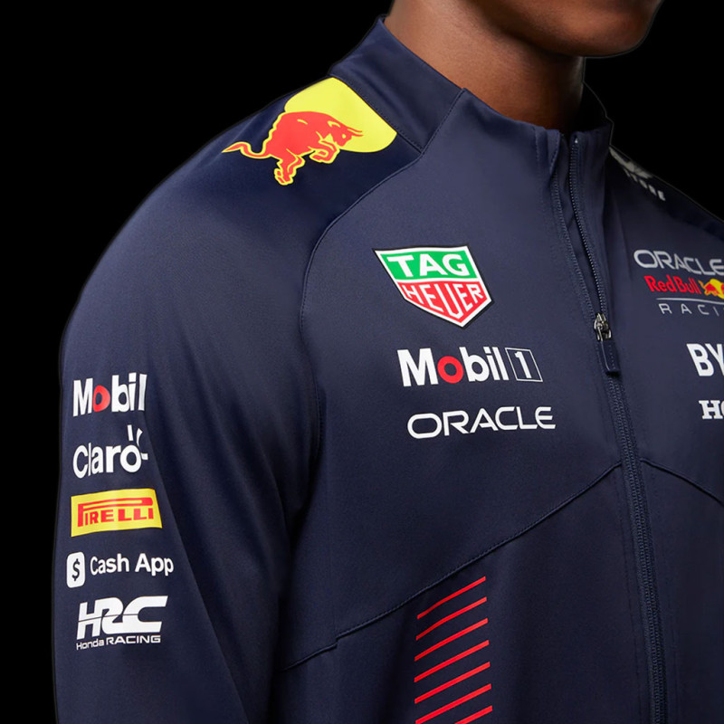 Red Bull- und Sponsorenlogos auf Brust, Schultern und Ärmeln