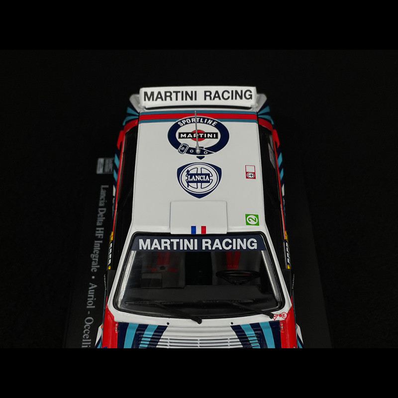 Mit seinen belüfteten Scheibenbremsen und seiner präzisen Lenkung verband der Delta 16V Kraft und Kontrolle und verschaffte den Fahrern einen entscheidenden Vorteil unter den schwierigen Bedingungen der Rallye. Die Martini-Racing-Lackierung mit ihren roten und blauen Streifen auf weißem Hintergrund unterstrich das Prestige des Fahrzeugs und sorgte für sofortige Wiedererkennbarkeit bei allen Meisterschafts-Rallyes.