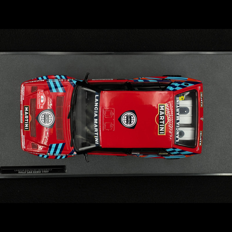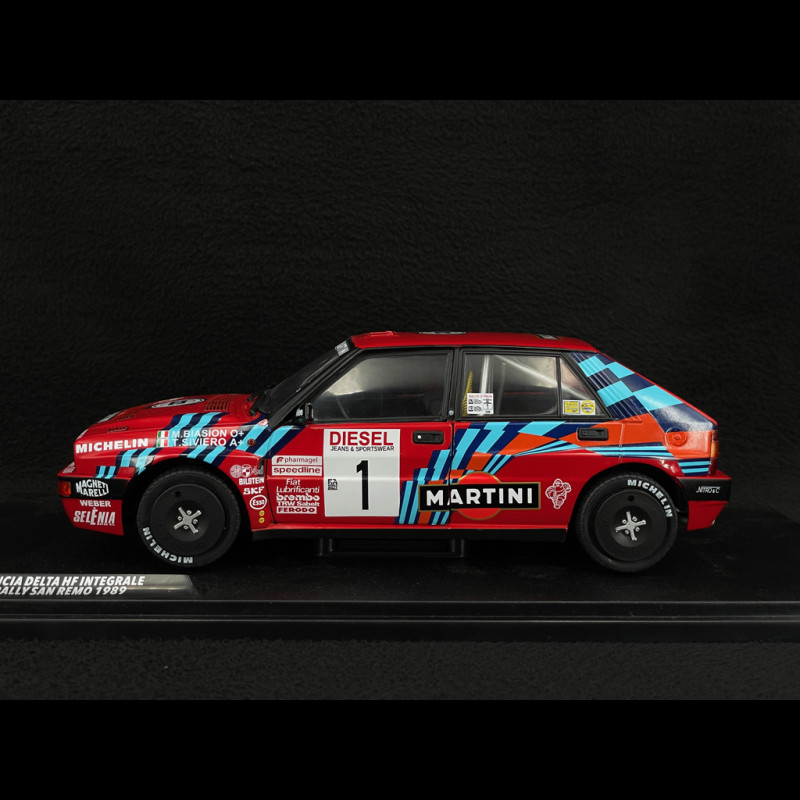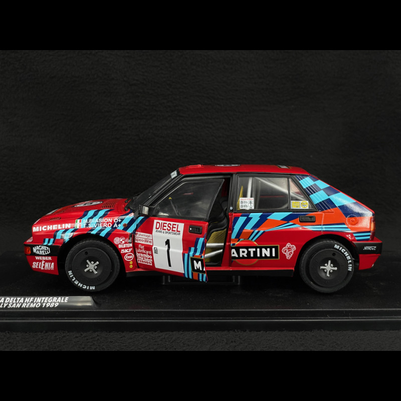 Dieses Miniaturmodell im Maßstab 1:18 ist der Lancia Delta HF Integrale #1 der Rallye Sanremo 1989 von Solido, gefahren von Miki Biasion und Tiziano Siviero. Es besteht aus Metallguss und verfügt über zu öffnende Vordertüren, lenkbare Räder und Gummireifen. Das Modell gibt die offizielle Rallye-Lackierung des Siegerwagens originalgetreu wieder (inklusive aller Aufkleber, Überrollkäfig und Renninnenausstattung).