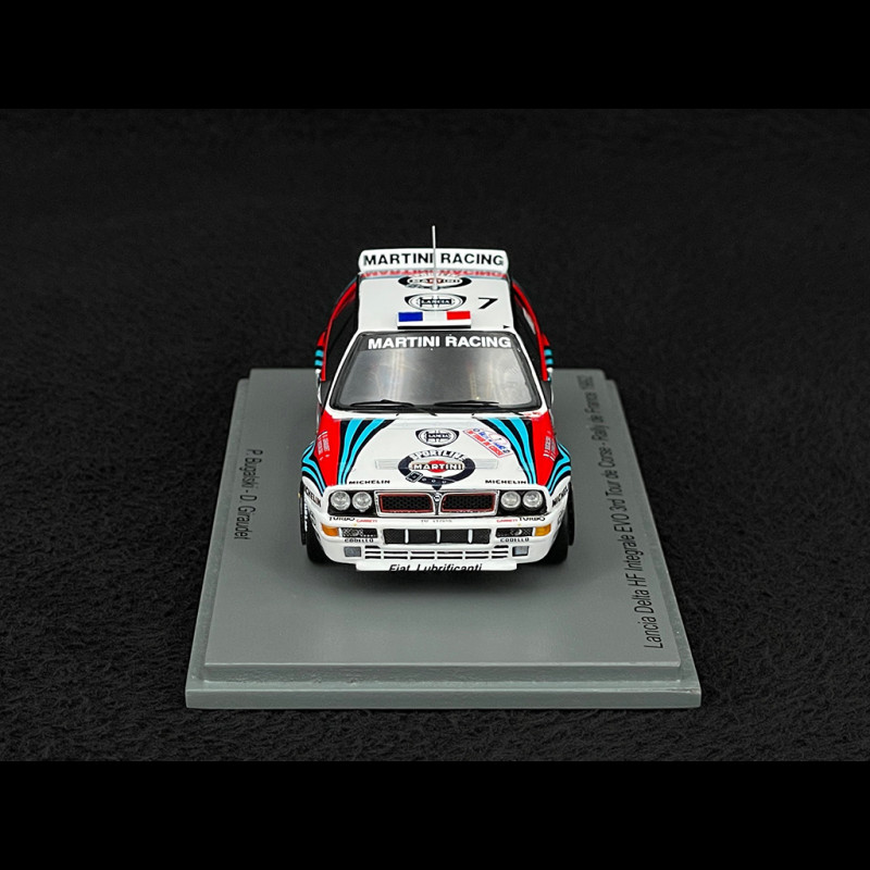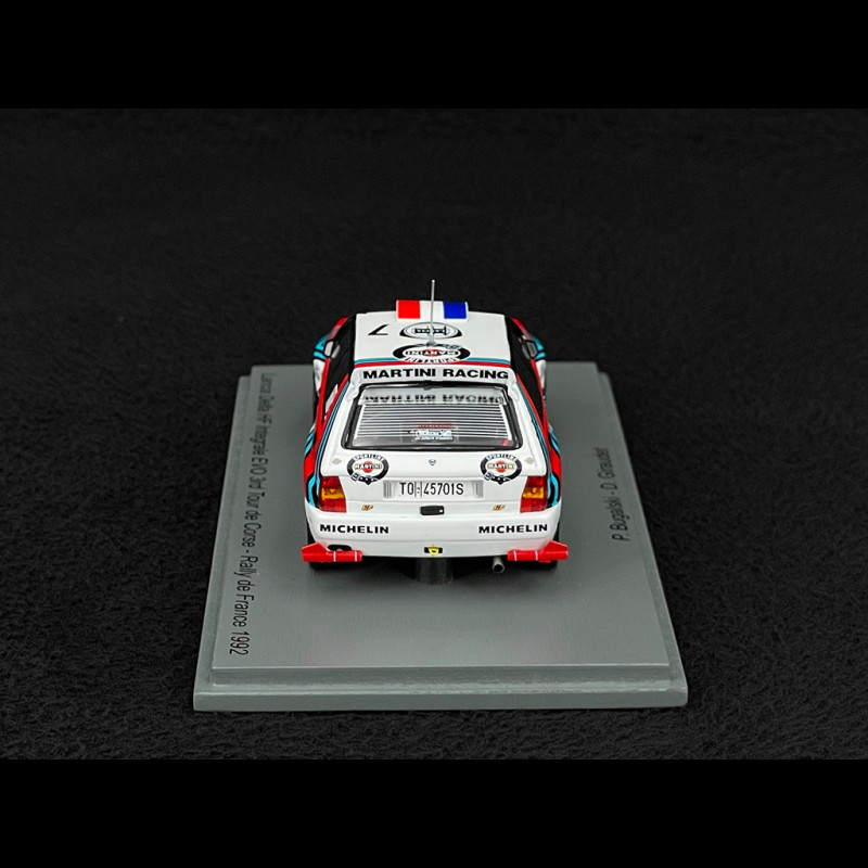 Der von Philippe Bugalski und Denis Giraudet gefahrene Lancia Delta HF Integrale Evoluzione #7 belegte bei der Rallye Tour de Corse 1992 den 3. Platz hinter dem Siegerwagen von Didier Auriol, der ebenfalls einen Delta fuhr. Mit seiner Martini-Racing-Lackierung, den verbreiterten Kotflügeln und dem Allradantrieb verkörpert dieser Evo die goldene Ära des Gruppe-A-Rallyesports und Lancias ultimative Dominanz auf dem korsischen Asphalt.