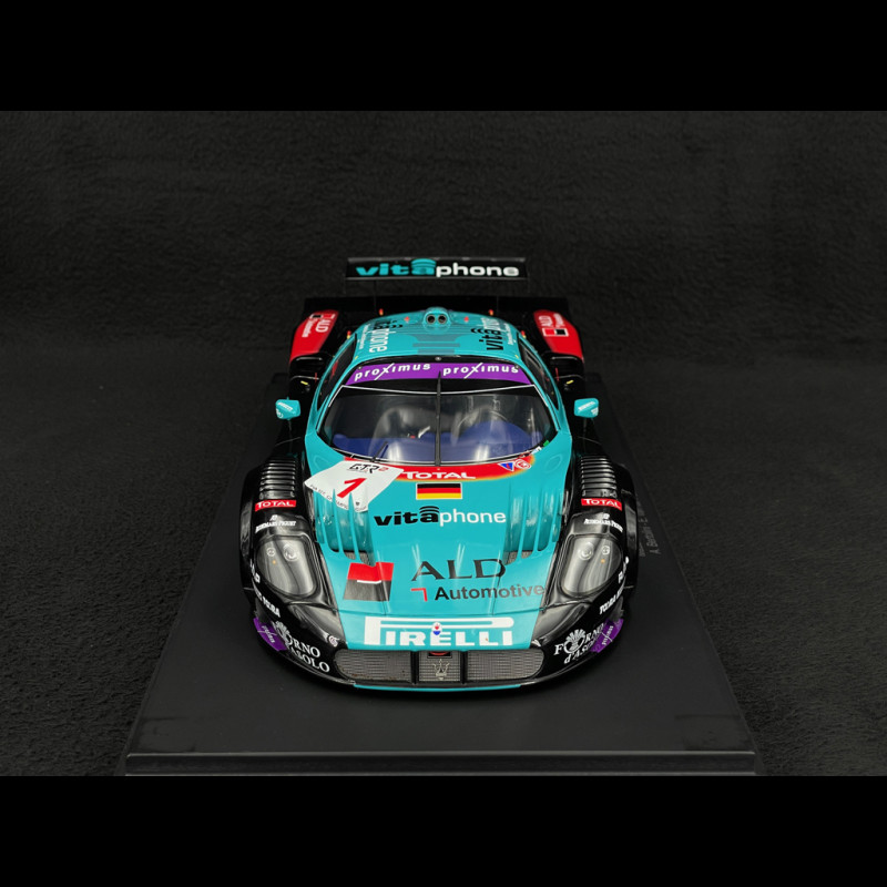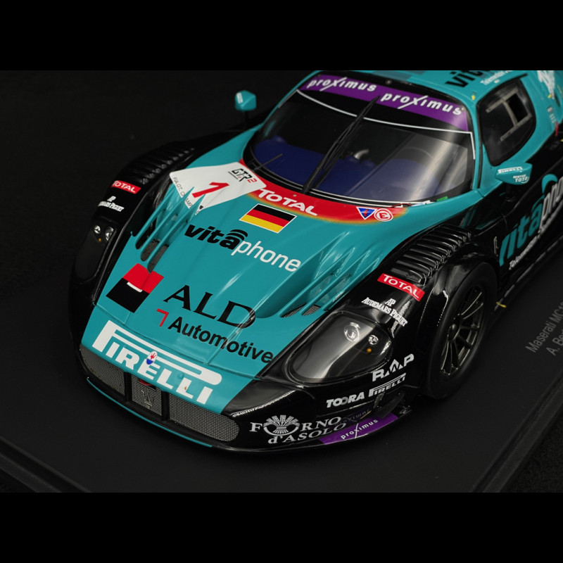 Diese Replik im Maßstab 1:18 aus Kunstharz ist eine Hommage an den Maserati MC12 GT1 Nr. 1, Sieger des 24-Stunden-Rennens von Spa 2006 mit den Fahrern Andrea Bertolini, Eric van de Poele und Michael Bartels. Die offizielle Lackierung und die Martini Racing-Markierungen sind originalgetreu nachgebildet und unterstreichen die aerodynamischen Linien und das ikonische Design des GT1. Die Details – Scheinwerfer, Felgen, Spoiler und Cockpit – sind fein gearbeitet und bieten einen beeindruckenden Realismus. Dieses Sammlerstück wird mit einer Vitrine geliefert und vereint hochwertige Verarbeitung, historische Authentizität und Prestige – ideal für Liebhaber von Langstreckenrennen und Maserati-Wettbewerben.