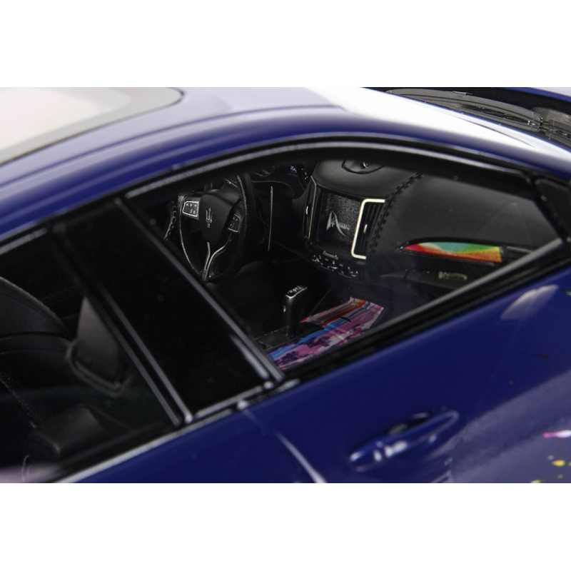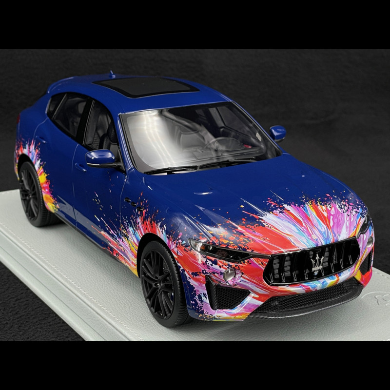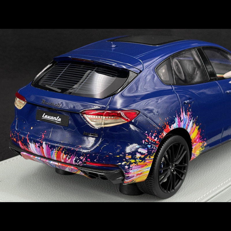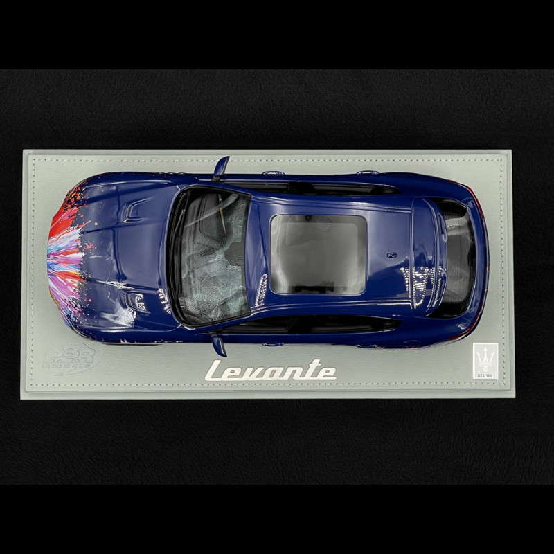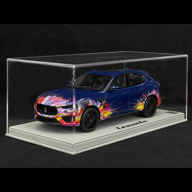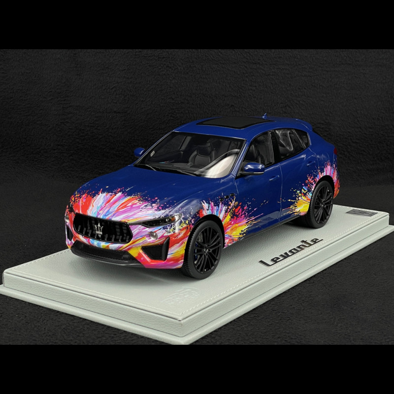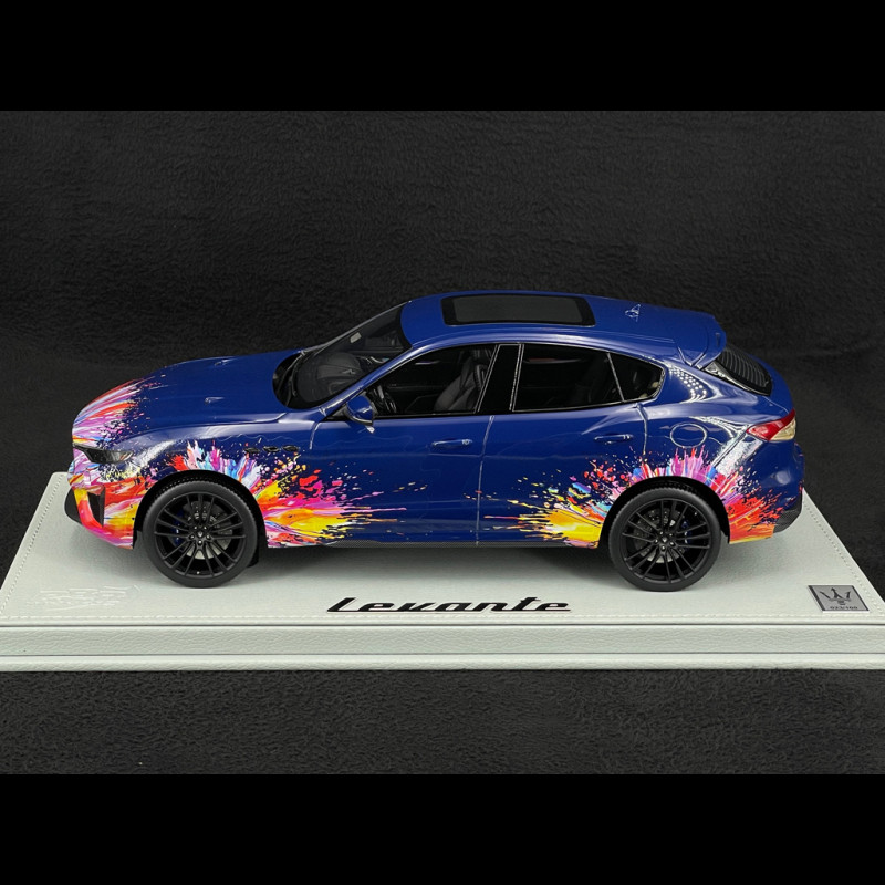 Diese Levante Trofeo Fuoriserie Edition im Maßstab 1:18 ist aus Resin gefertigt und besticht durch ca. 200 individuell gestaltete Details, die allesamt von Hand montiert und dekoriert wurden, inklusive der Anbringung der Decals. Die Karosserie in Blu Stradale ist mit mehrfarbigen Sprühmustern versehen, die sich bis ins Innere erstrecken und das Interieur, die Mittelkonsole und das Armaturenbrett umfassen. Dies spiegelt das Konzept der „kreativen Explosion“ des Fuoriserie-Programms wider. Das Modell wird auf einem Sockel mit Glasabdeckung präsentiert und ist auf 100 Stück limitiert. Damit ist es ein äußerst exklusives Sammlerstück unter den italienischen Sport-SUVs.