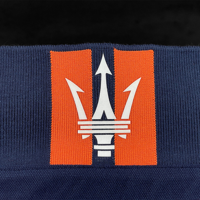 Das Maserati-Dreizack-Logo ist unter dem Kragen verborgen
