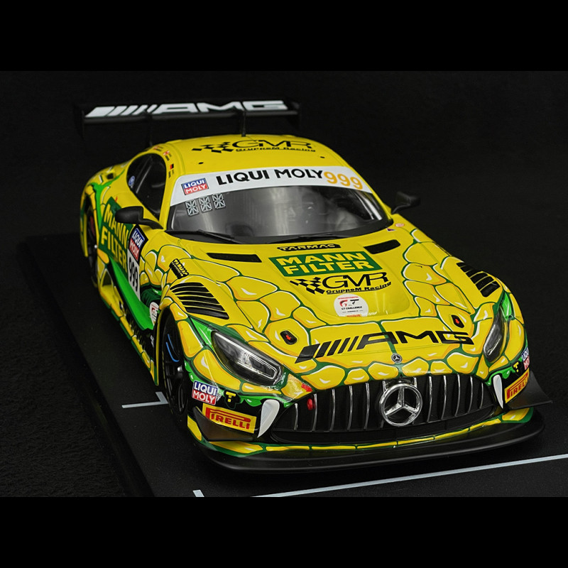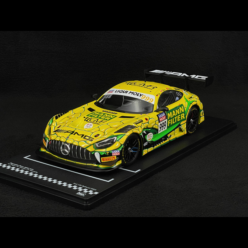 Diese detailgetreue Nachbildung des Mercedes-AMG GT3 Evo mit der Startnummer 999 im Maßstab 1:18, der beim Bathurst 12 Hour 2023 den dritten Platz belegte, würdigt die Leistung des GruppeM Racing Teams mit Maro Engel, Mikael Grenier und Raffaele Marciello auf dem legendären Mount Panorama Circuit in Australien.
