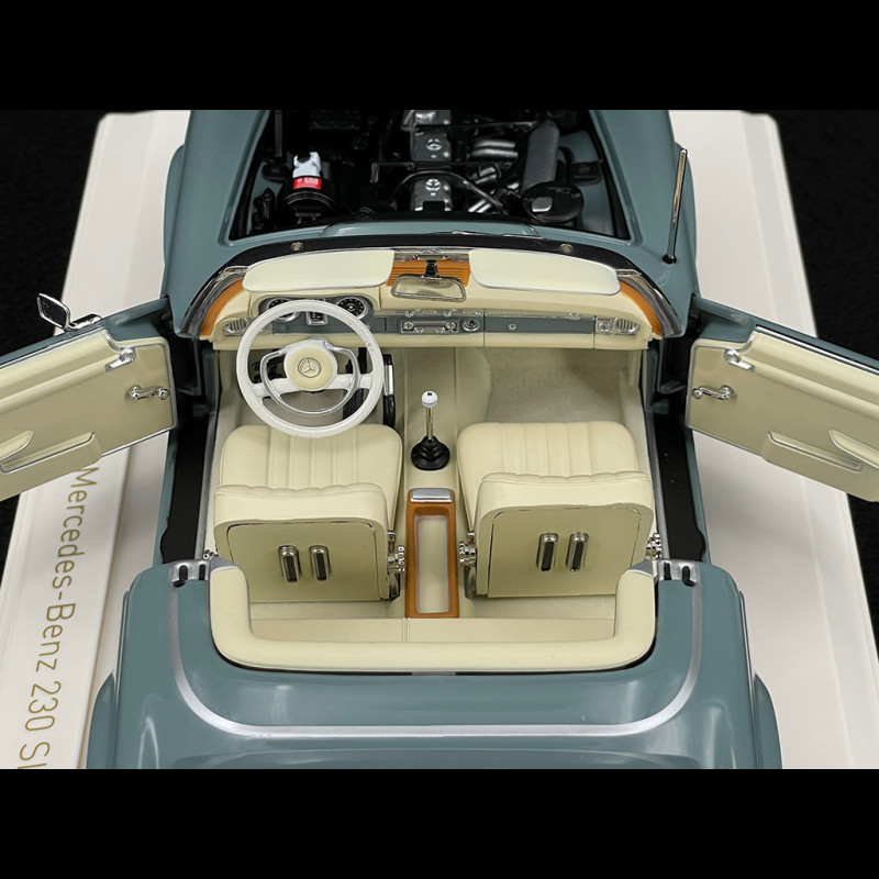 Diese Miniatur im Maßstab 1:18 ist eine elegante Nachbildung des Mercedes-Benz 230 SL von 1963 in seiner legendären Farbe Bleu Horizon. Die funktionstüchtigen Türen und das abnehmbare Dach geben den Blick frei auf den detailgetreu gestalteten Innenraum mit originalgetreuem Armaturenbrett, Sitzen und Lenkrad. Die Außenausstattung ist präzise: Die Räder, Scheinwerfer und Chromverzierungen sind perfekt nachgebildet und unterstreichen den zeitlosen Charme dieses klassischen Roadsters. Ein hochwertiges Sammlerstück, das Realismus, Qualität und Funktionalität für Liebhaber historischer Autos vereint.