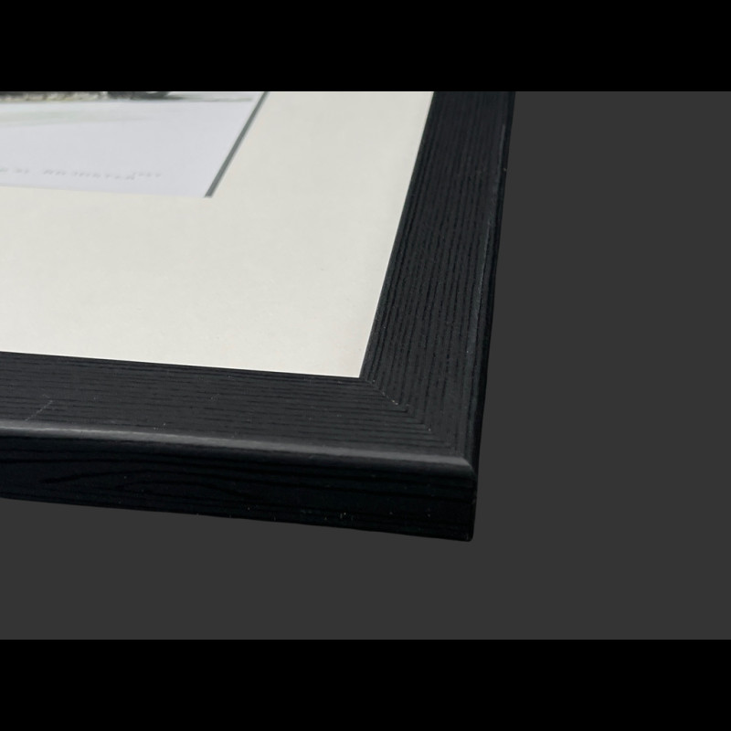 Mit schwarz lackiertem Holzrahmen, doppelter Passepartout und Schutzglas