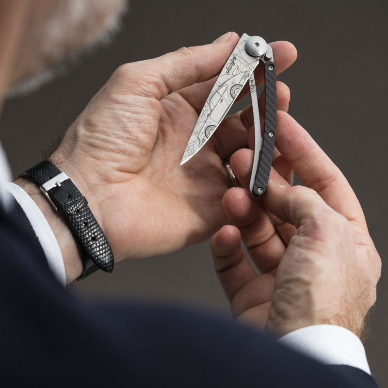 Auf der Klinge ist ein Fahrzeugmotiv eingraviert, das von der legendären Porsche 930 Turbo inspiriert ist. Ultraleicht, elegant und voller Charakter. Griff aus Carbonfaser, lasergeätzte Klinge mit Titanzierung.