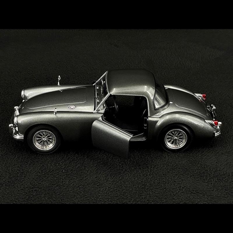 Das Triple9-Modell T9-1800161 bildet die geschlossene Coupé-/Hardtop-Version in Metallic-Grau mit den eleganten Proportionen des MGA nach: lange Motorhaube, zurückgesetzte Fahrgastzelle, niedriges Hardtop und straffe Karosserielinien. Im Schaufenster verleiht dieses nüchterne Grau in Kombination mit Chrom und Hardtop dem Wagen eine sehr klassische Präsenz und passt perfekt in ein Regal mit „englischen Autos der Sechzigerjahre“ neben Triumph, Austin-Healey oder Jaguar.