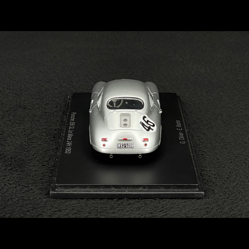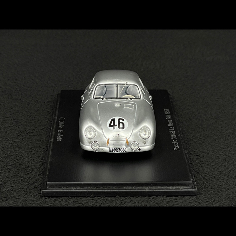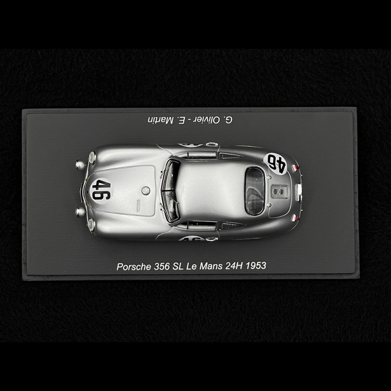 Spark bildet den Porsche 356 Nr. 46 Le Mans 1953 im Maßstab 1:43 detailgetreu nach. Das Modell besticht durch die schlichte Lackierung der damaligen Zeit, die Startnummern und die spezifischen Details des von G. Olivier und E. Martin gefahrenen Wagens. Die aus Kunstharz gefertigte und auf einem Sockel mit Vitrine präsentierte Miniatur hebt die charakteristischen Kurven des 356 hervor und ergänzt ideal eine Serie, die den ersten in der Sarthe eingesetzten Porsches gewidmet ist.