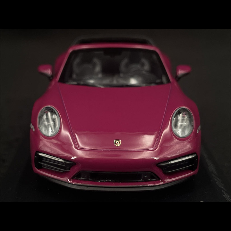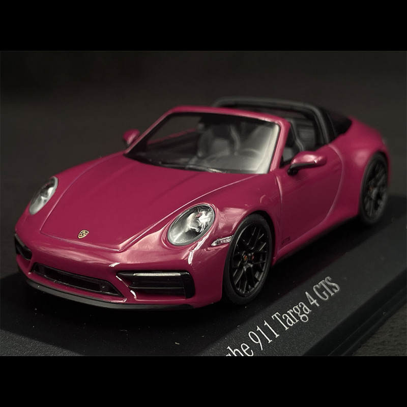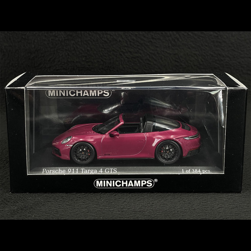 Dieses Modell im Maßstab 1:43 zeigt einen Porsche 911 (992) Targa 4 GTS 2022 von Minichamps in der Farbe Sternrubin Neo. Es handelt sich um ein vormontiertes Diecast-Modell ohne zu öffnende Teile, das auf einem Präsentationsständer geliefert wird. Die limitierte Auflage beträgt 384 Stück. Das Modell bildet die Targa 4 GTS-Konfiguration mit schwarzem Überrollbügel, schwarzen GTS-Felgen und der intensiven Himbeerrosa-Lackierung detailgetreu nach, die selbst in diesem kleinen Maßstab besonders spektakulär wirkt.