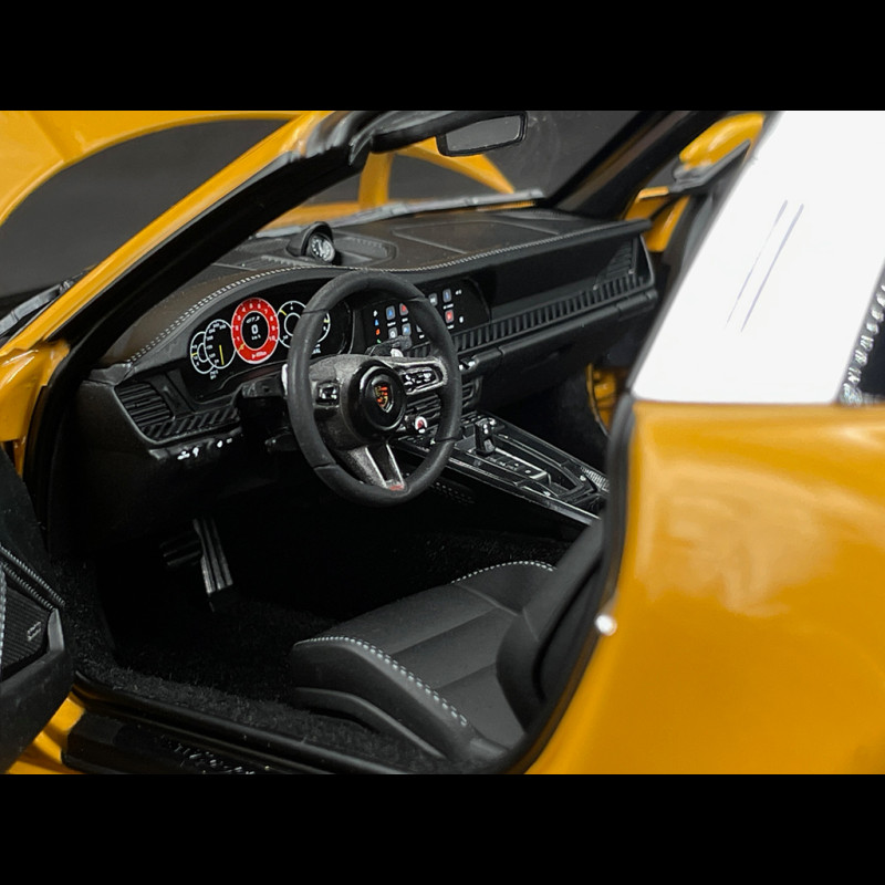Diese Nachbildung im Maßstab 1:18 ist ein besonders umfassendes Sammlerstück, das den Standards von Norev für diese neue Generation treu bleibt. Sie zeichnet sich durch ihre zu öffnenden Teile (Türen und Kofferraumdeckel) aus, vor allem aber durch ihr abnehmbares Dach, mit dem Sie die Silhouette des Modells nach Ihren Präsentationswünschen verändern können. Die Lackierung in Bahama-Gelb ist mit beeindruckender Präzision aufgetragen und hebt den Kontrast zum Targa-Überrollbügel und den für die GTS-Ausführung typischen schwarzen Details perfekt hervor. Die Finesse der LED-Matrix-Scheinwerfer und die Sorgfalt, mit der der digitale Innenraum gestaltet wurde, machen dieses Modell zu einer unverzichtbaren Reproduktion, um das Jahr 2025 zu feiern.
