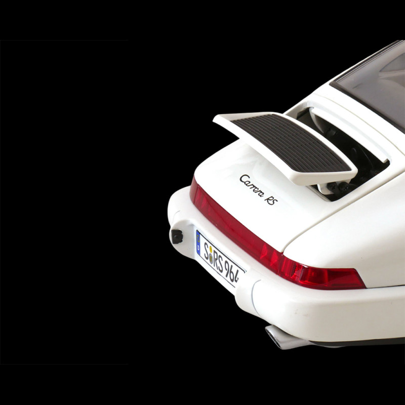 Diese detailgetreue Nachbildung im Maßstab 1:12 unterstreicht die eleganten Linien des 964 RS in einer dezenten weißen Lackierung, die perfekt durch die ikonischen Cup-Felgen dieser Generation ergänzt wird. Das aus Metall gefertigte Modell im großen Maßstab macht sich hervorragend in einer Vitrine und fängt mit seinen Details an Karosserie, Innenraum und Fahrwerk den radikalen Geist des echten RS perfekt ein.