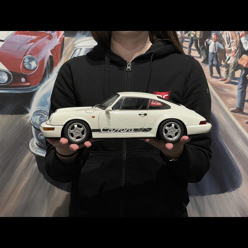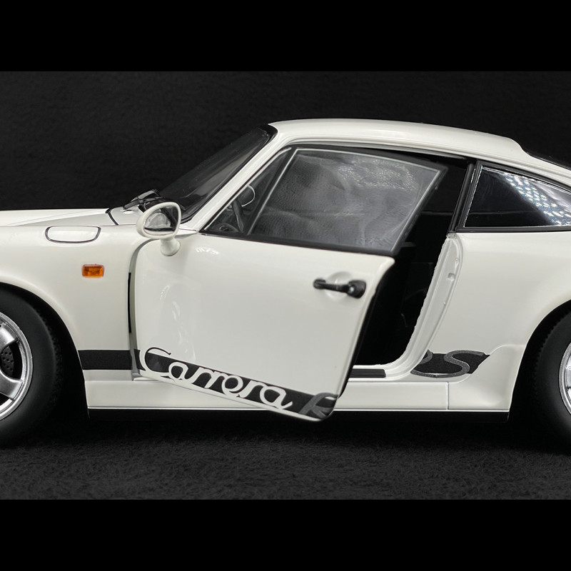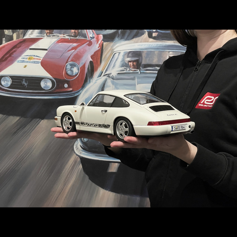 Diese detailgetreue Nachbildung im Maßstab 1:12 unterstreicht die klaren Linien des 964 RS in Weiß, perfekt ergänzt durch die legendären Cup-Felgen dieser Generation. Das aus Metall gefertigte Modell im Großformat ist ein echter Blickfang und fängt mit seinen Karosserie-, Interieur- und Fahrwerksdetails den radikalen Geist des echten RS perfekt ein. Die „Carrera RS“-Streifen an der unteren Karosserie erinnern an den ikonischen Schriftzug der 911 Carrera RS-Modelle der 1970er-Jahre, der ursprünglich als gut sichtbare Rennmarkierung an den Seiten gedacht war. Bei diesem 964 wird dieses Erbe fortgeführt, die Silhouette betont und sofort der radikalere Charakter der RS-Version signalisiert, eine klare Anspielung auf den historischen 2.7 Carrera RS.