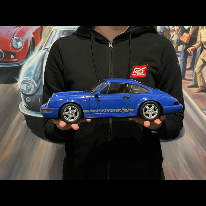 Diese detailgetreue Nachbildung im Maßstab 1:12 unterstreicht die klaren Linien des 964 RS in Blau, perfekt ergänzt durch die legendären Cup-Felgen dieser Generation. Das aus Metall gefertigte Modell im Großformat ist ein echter Blickfang und fängt mit seinen Karosserie-, Interieur- und Fahrwerksdetails den radikalen Geist des echten RS perfekt ein. Die „Carrera RS“-Streifen an der unteren Karosserie erinnern an den ikonischen Schriftzug der 911 Carrera RS-Modelle der 1970er-Jahre, der ursprünglich als gut sichtbare Rennmarkierung an den Seiten gedacht war. Bei diesem 964 wird dieses Erbe fortgeführt, die Silhouette betont und sofort der radikalere Charakter der RS-Version signalisiert, eine klare Anspielung auf den historischen 2.7 Carrera RS.