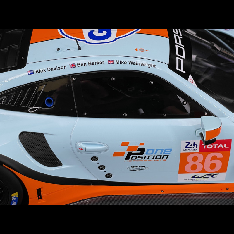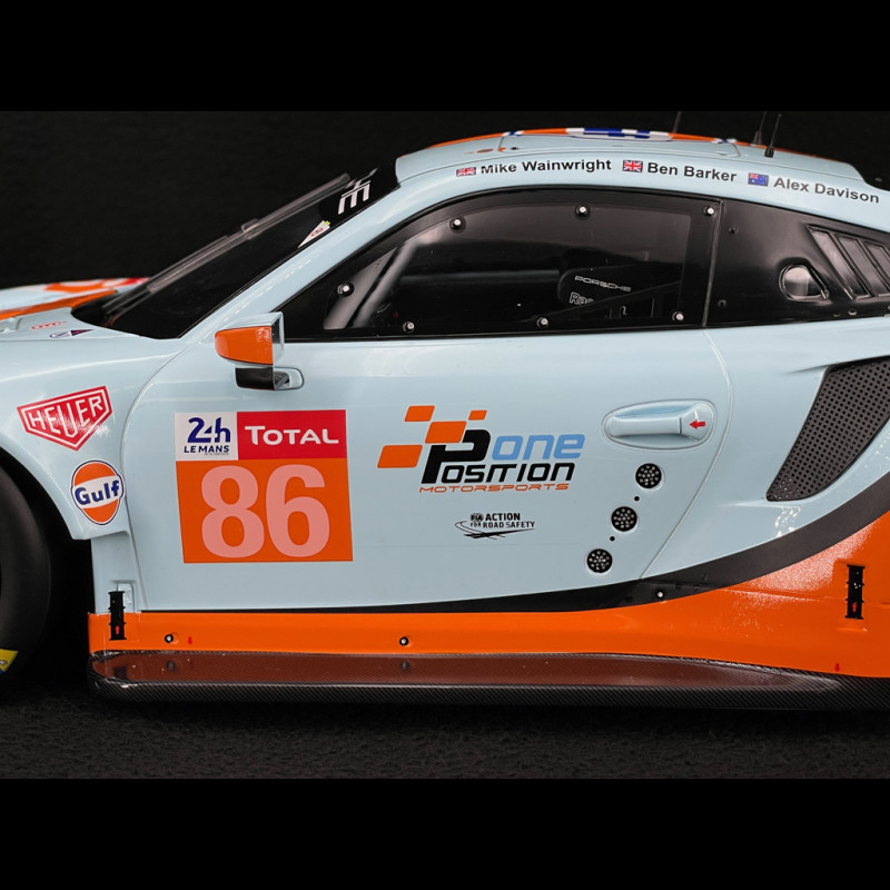 Der Gulf Racing 911 RSR Nr. 86 verwendet denselben 4,0-Liter-Motor wie die Werks-RSRs, besticht aber durch die Gulf-Lackierung in Himmelblau und Orange mit einem orangefarbenen Mittelstreifen, der sich von der Front bis zum Heck erstreckt, und weißen Startnummern. In Le Mans 2018 stach er dank dieses starken Kontrasts zu den extrem muskulösen Linien des 911 RSR mit seinen breiten Kotflügeln, der niedrigen Frontpartie und dem massiven Diffusor deutlich hervor.