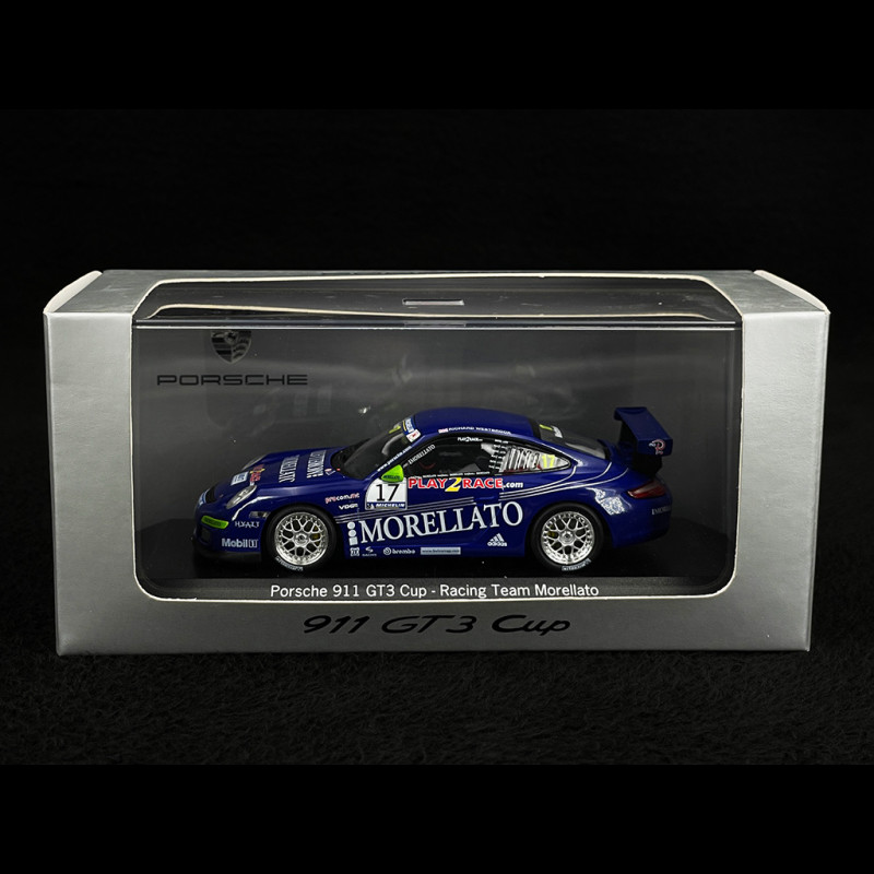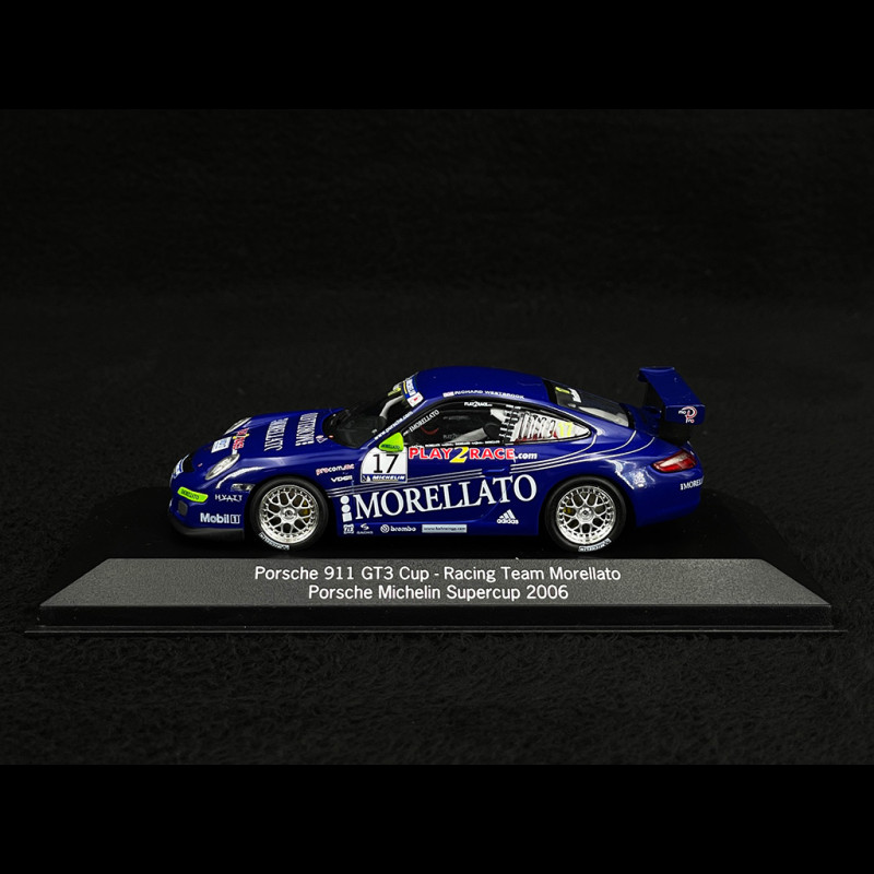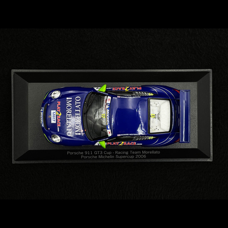 1:43 Modellauto des Porsche 911 GT3 Cup aus der Porsche Supercup 2006. Gefahren von Richard Westbrook (#17) für das Racing Team Morellato. Originale dunkelblaue Lackierung mit Morellato-Sponsoring, produziert von Minichamps.