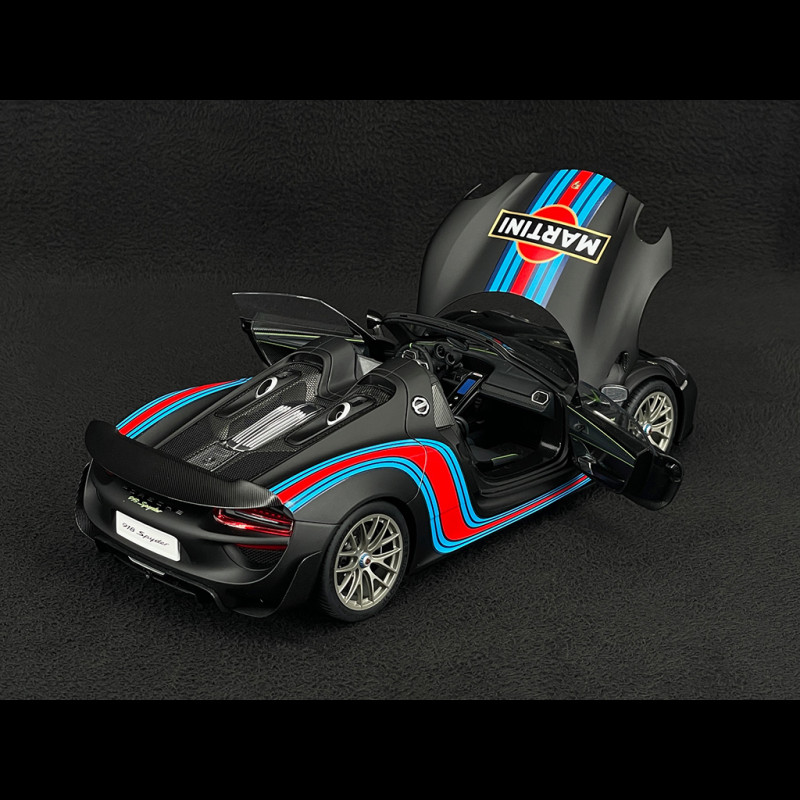 Der 887 PS starke Hybrid-Hypercar, der 918 Spyder im Weissach-Paket, wird mit Magnesiumfelgen, deutlicher Gewichtsreduzierung und rennstreckenorientierter Abstimmung nochmals radikaler und bietet die Performance eines straßenzugelassenen Rennwagens. Die Martini-Lackierung ist eine Hommage an Porsches Langstreckenprototypen. Dreifarbige Streifen betonen die flachen, breiten Linien des Roadsters, insbesondere in Kombination mit dem aggressiven mattschwarzen Finish.
