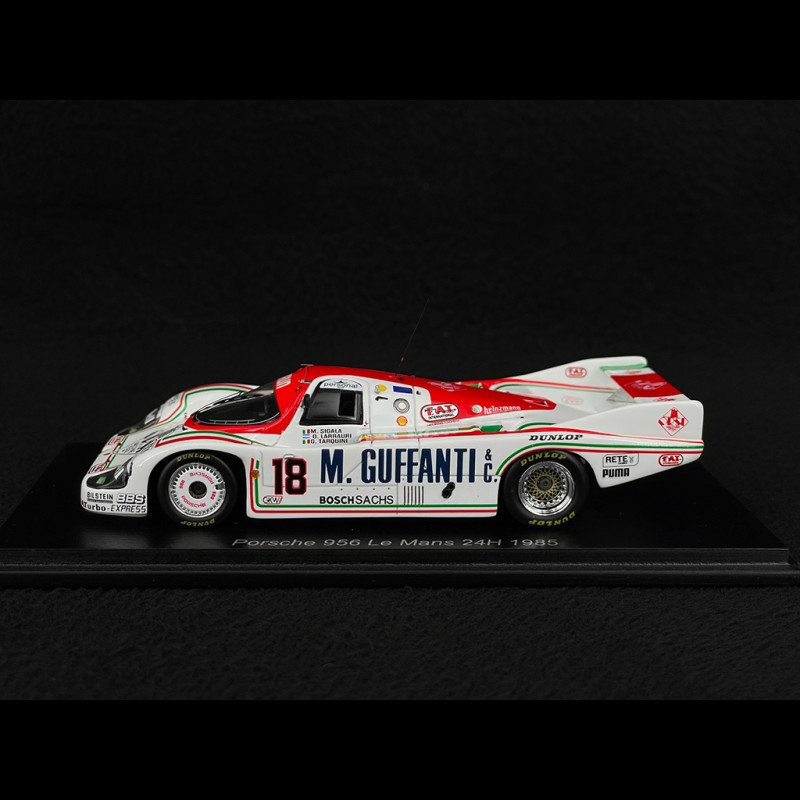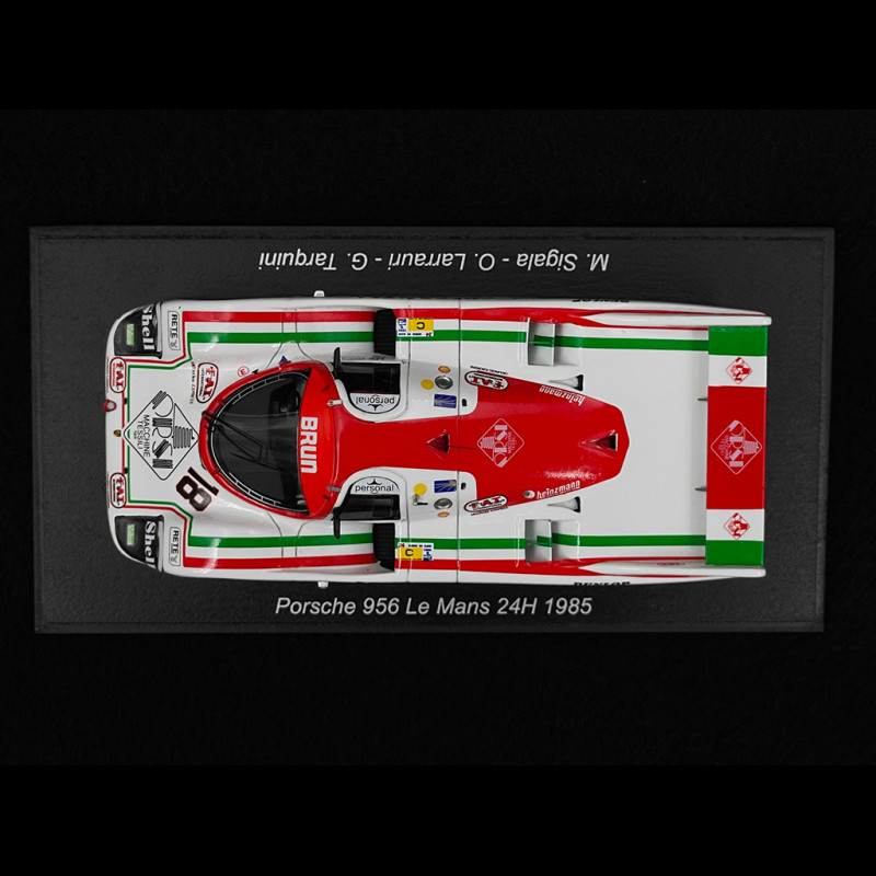 Das Porsche 956 Nr. 18 Modell im Maßstab 1:43 gibt die flache, stromlinienförmige Silhouette der Gruppe-C-Prototypen mit ihrer langen Nase, dem Kuppelcockpit und dem breiten Heck mit schmalem Flügel detailgetreu wieder. Die Lackierung entspricht exakt den Farben, Nummern und Markierungen des Wagens, mit dem Sigala, Larrauri und Tarquini 1985 in Le Mans fuhren, und ist mit einem gestochen scharfen Tampondruck über die gesamte Karosserie versehen. Die Details sind akribisch ausgeführt: Zentralverschlussfelgen, Lufteinlässe, Motorhaubenverschlüsse und weitere Elemente sind auf einem Sockel mit Namensschild montiert und bereit für die Vitrine.