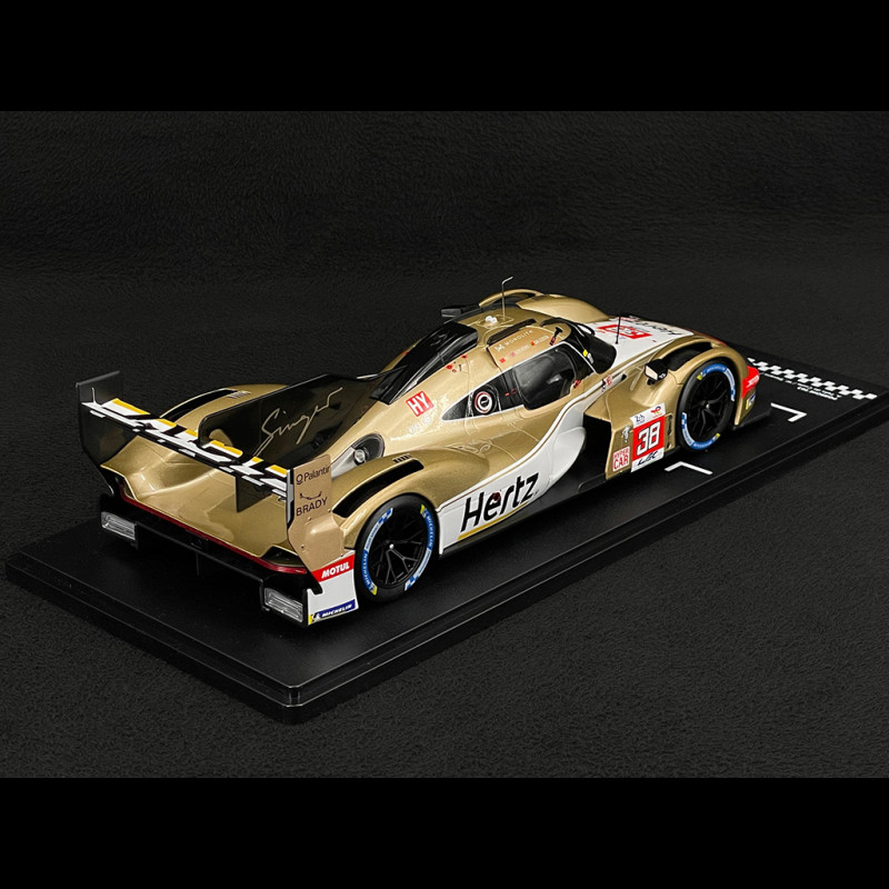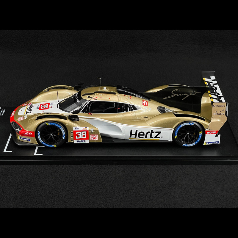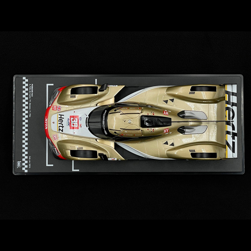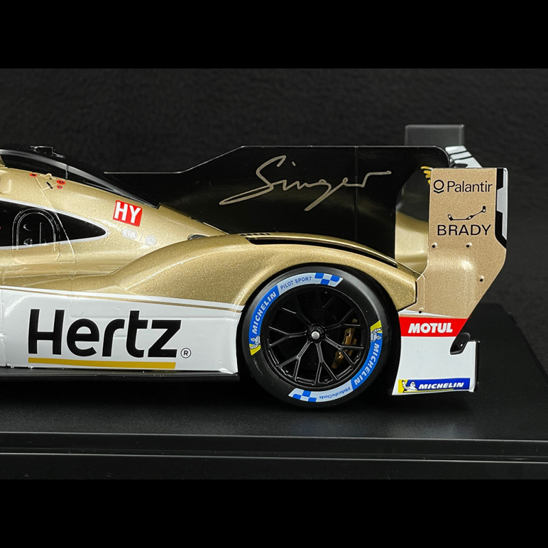 Im Maßstab 1:18 betont die goldmetallicfarbene Karosserie jede Kante: Die abfallende Frontpartie, die seitlichen Lufteinlässe und der Heckdiffusor sind perfekt sichtbar, sobald das Modell in einer Vitrine leicht geneigt wird. Der Kontrast zwischen Gold, weißen Bereichen, schwarzen Akzenten und den Hertz Jota-Logos verleiht diesem Modell eine spektakuläre Präsenz und macht es zum idealen Herzstück einer Hypercar-/Le-Mans-Sammlung, insbesondere neben den Werks-Porsche-Penske-963.