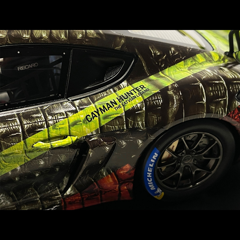 Die „Hunter“-Lackierung geht auf die symbolische Figur des Crocodile Dundee zurück, der den wagemutigen Jäger und Abenteurer verkörpert und mit dem lettischen Spitznamen „Kaimanu mednieks“ (Kaiman-Jäger) in Verbindung gebracht wird. Sie ist eine direkte Anspielung auf den Namen Cayman und vermittelt visuell den Raubtierinstinkt, die Kraft und die Aggressivität des Autos auf der Rennstrecke.