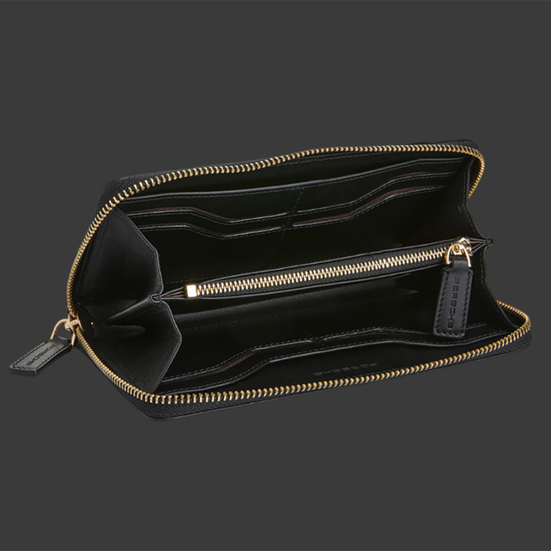 Die Designelemente sind von der Automobilwelt inspiriert: Die Konturen der Kartenfächer erinnern an die Linien der Taycan-Scheinwerfer, während die Kontrastnähte an den Stil von Porsche-Sitzen erinnern.