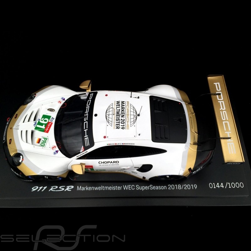 Porsche 911 RSR FIA-Weltmeisterschaft Celebration : eine Sonderlackierung für die Saison 2019 für Autos, die den Titel des WEC-Weltmeisters gewonnen haben. Die Farbe Gold hat das Rot des Porsche Motorsport GT Teams während der gesamten Karosserie ersetzt und das Logo des WEC-Champions erscheint groß auf den Dächern der beiden offiziellen Autos. Ein neues Weg, die 2018 in Le Mans mit dem Pink Pig und den Rothmans eingeweihte Sonderlackierung fortzusetzen.