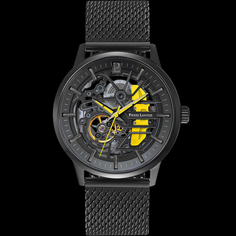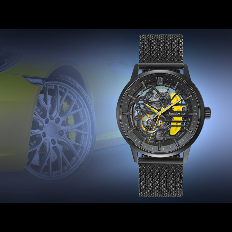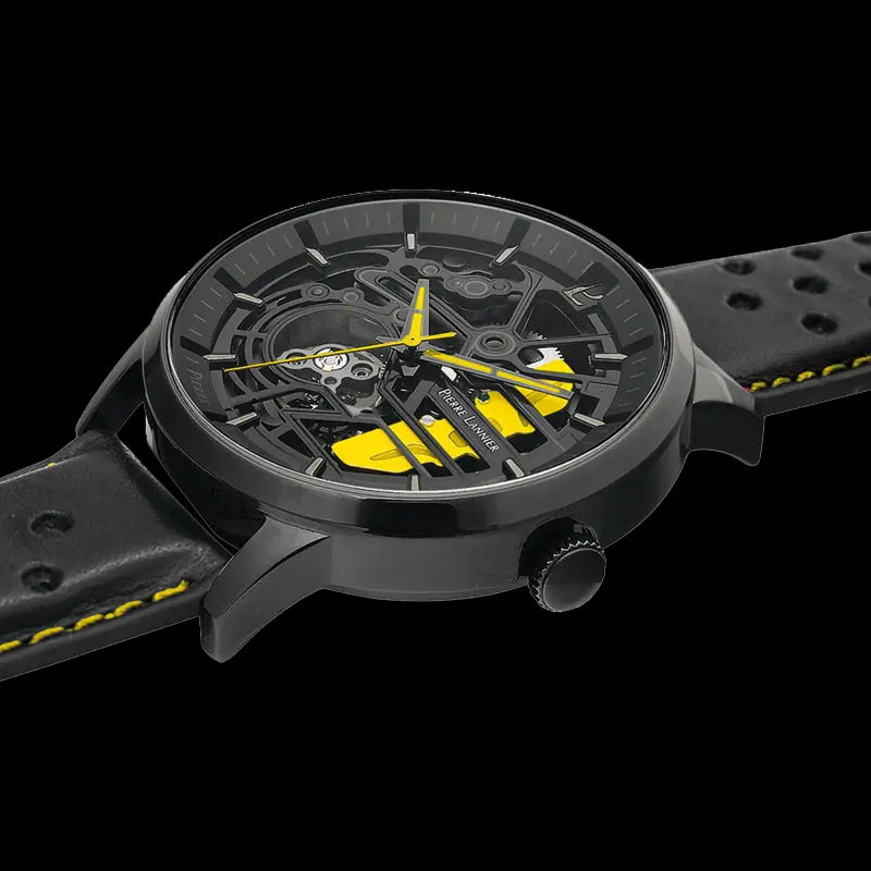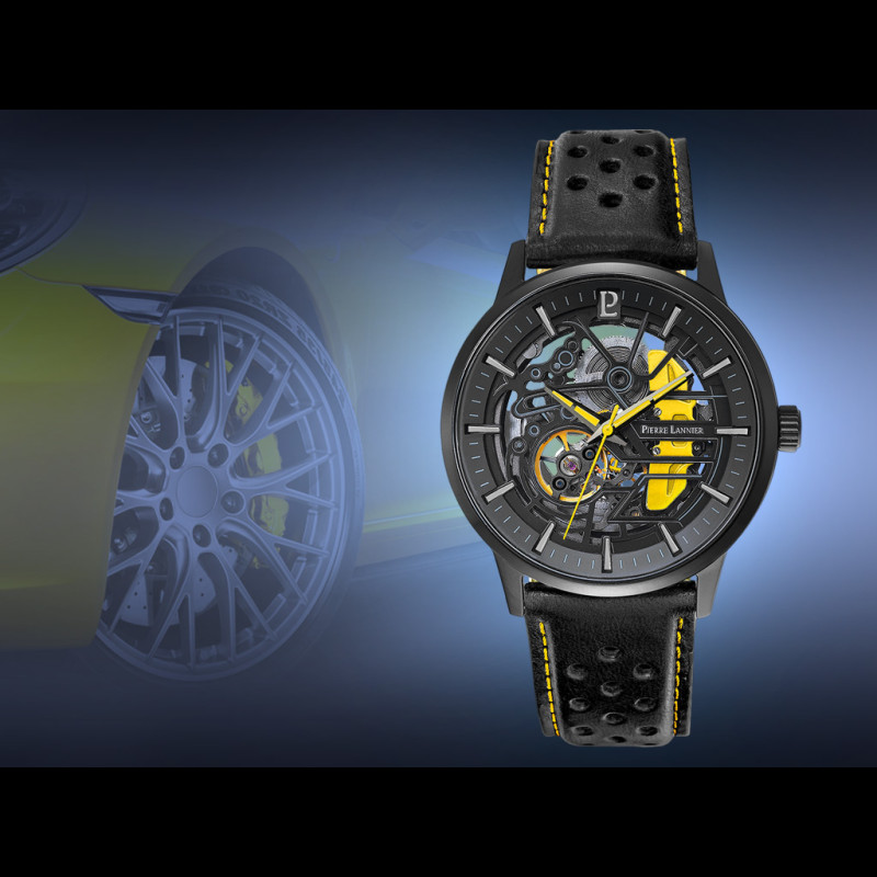 Automatikuhr Koffer Schwarz / Gelb Leder- oder Stahlarmband Hergestellt in Frankreich Pierre Lannier 385C449