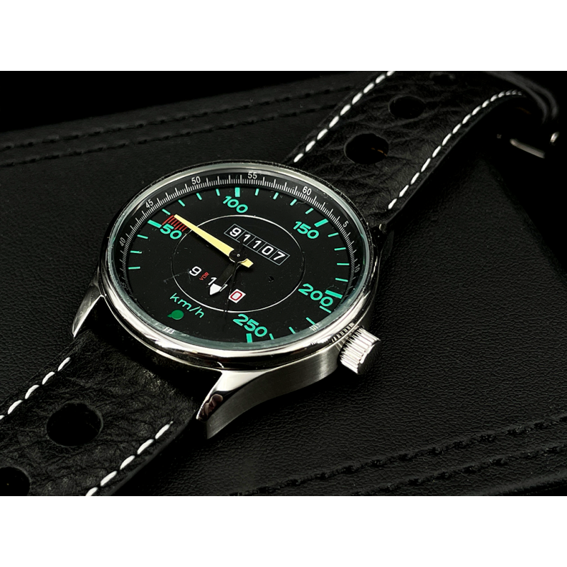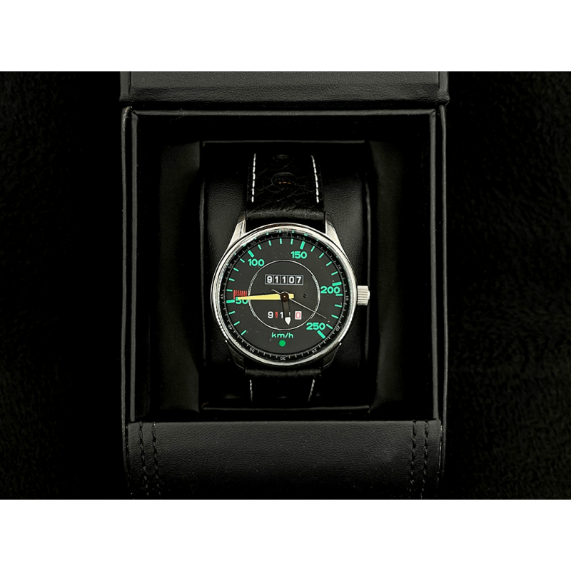 Inspiriert vom legendären Tachometer des Porsche 911 Classic (1963–1969) zeichnet sich diese Automatikuhr durch das ikonische Design mit schwarzem Hintergrund, grünen Ziffern und einer Skala bis 250 km/h aus, das an die Modelle der 1960er Jahre erinnert.