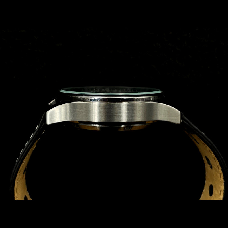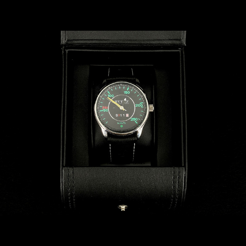 Inspiriert vom legendären Tachometer des Porsche 911 Classic (1963–1969) zeichnet sich diese Automatikuhr durch das ikonische Design mit schwarzem Hintergrund, grünen Ziffern und einer Skala bis 250 km/h aus, das an die Modelle der 1960er Jahre erinnert.