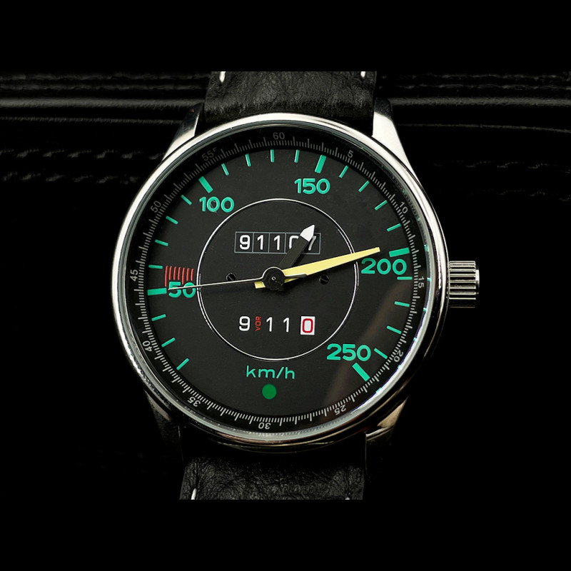 Porsche 911 Classic Automatikwerk Uhr 250 km/h Tachometer 1963 - 1969 schwarz Wahl / grüne Zahlen Hergestellt in Deutschland