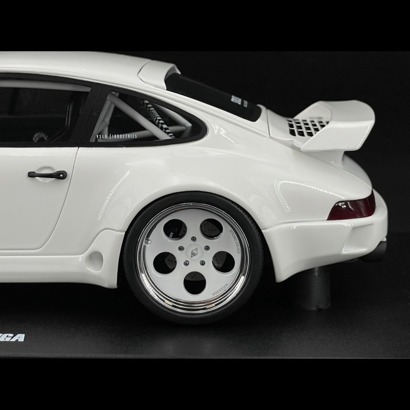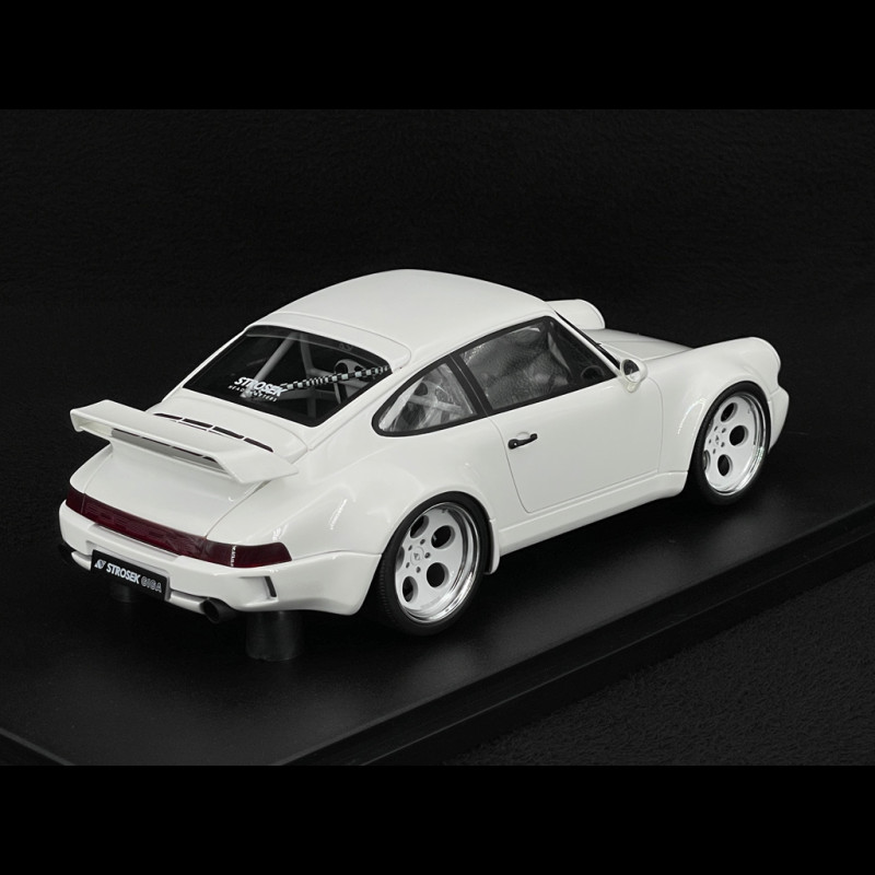 Diese von GT Spirit nachgebildete Porsche 911 (Typ 964), modifiziert vom deutschen Tuner Strosek, ist eine wahre Rarität und fängt die Essenz des 90er-Jahre-Tunings mit ihrem sehr untypischen Breitbau-Kit ein; sie zeichnet sich insbesondere durch den Ersatz der Originalscheinwerfer durch spezifische kleine Rundoptiken, neu gestaltete vordere und hintere Stoßfänger, einen imposanten Heckflügel und Felgen mit sehr tiefem Bett aus, alles präsentiert in der Farbe Gletscherweiß.