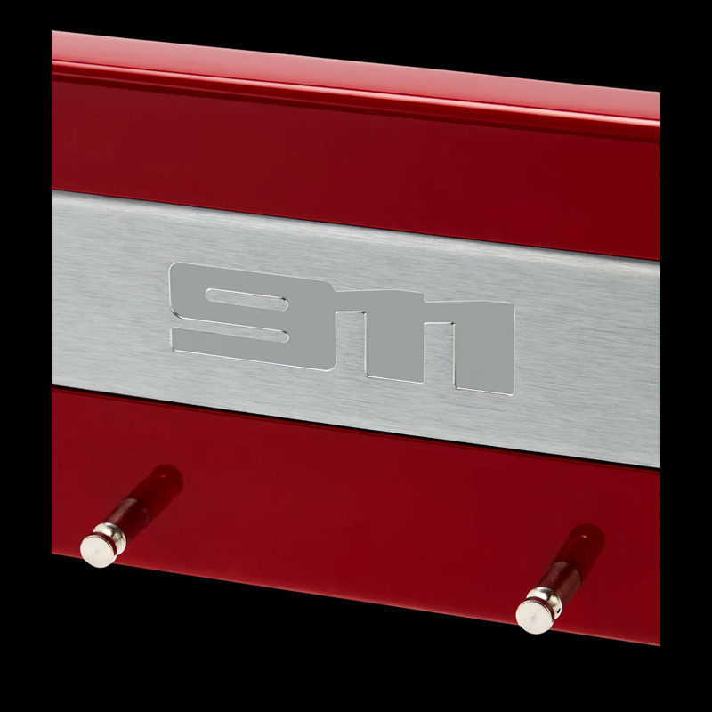 Mit seiner glänzenden karminroten Oberfläche und einer authentischen Porsche 911 Einstiegsleiste aus gebürstetem Stahl bietet es Platz für bis zu vier Autoschlüssel und verleiht Ihrem Zuhause oder Ihrer Garage einen Hauch von Eleganz.