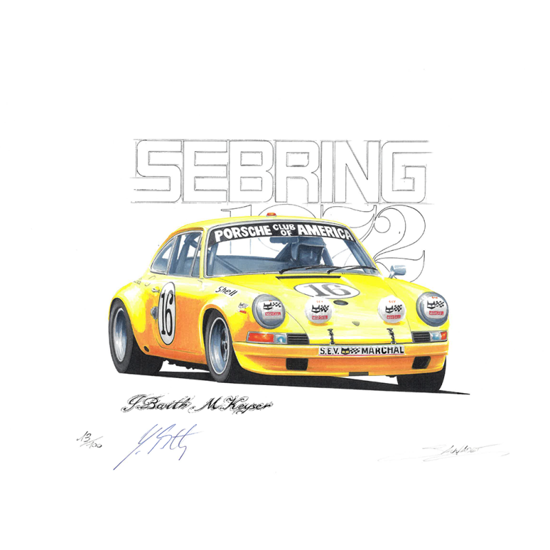 Porsche 911S n° 16 12h Sebring 1972 Original Zeichnung mit Unterschrift Jürgen Barth / Sébastien Sauvadet