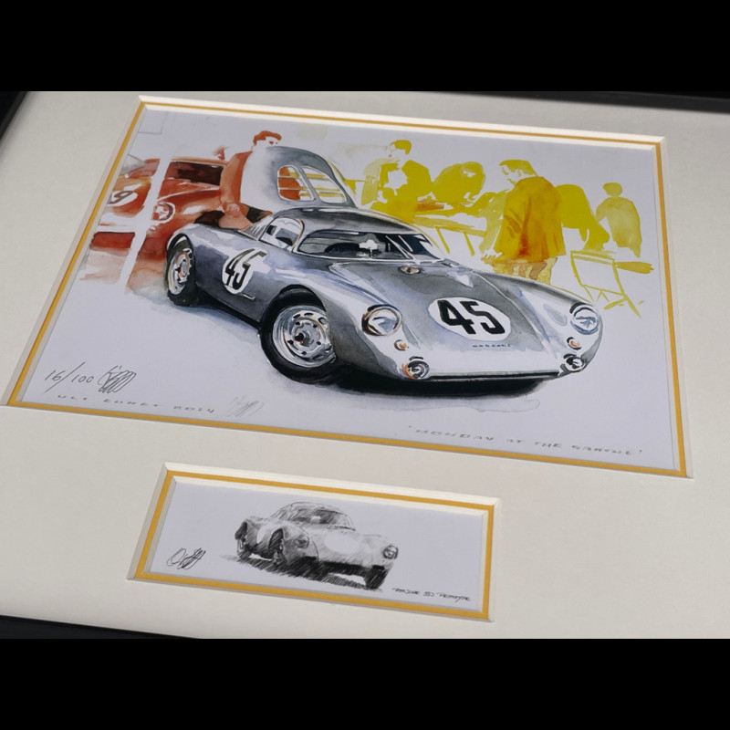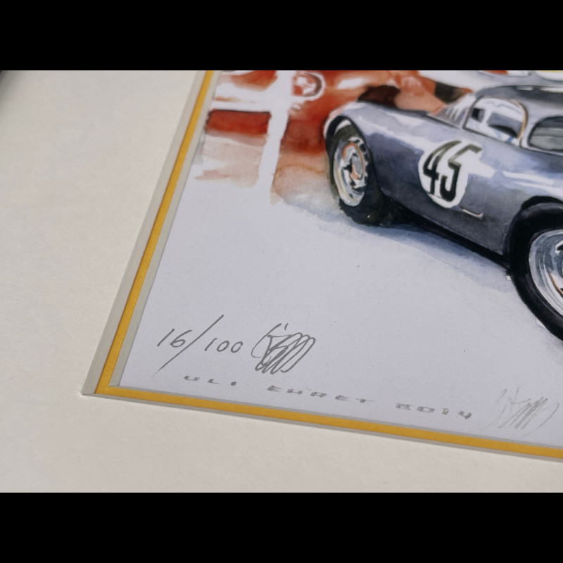 Porsche Rahmen 550A Coupé n° 25 24h Le Mans 1956 Schwarzer Holzrahmen mit Skizze 25 x 30 cm - Uli Ehret